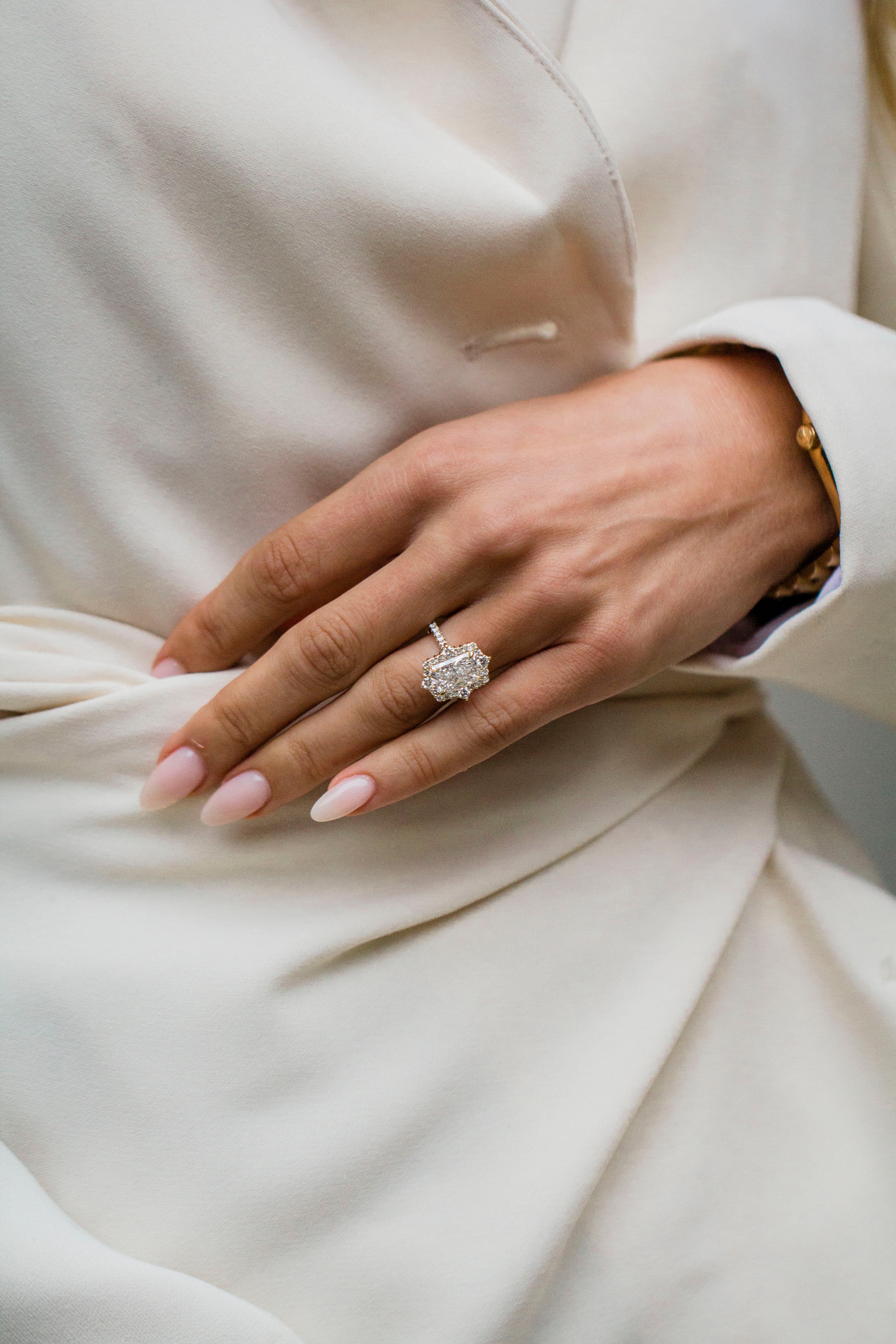 This stunning 3.32 carat radiant is framed perfectly by our Arielle cluster halo for maximum sparkle. The setting is finished to perfection with a pavé cathedral, pavé underside, and pavé bridge set in 14K yellow gold.
