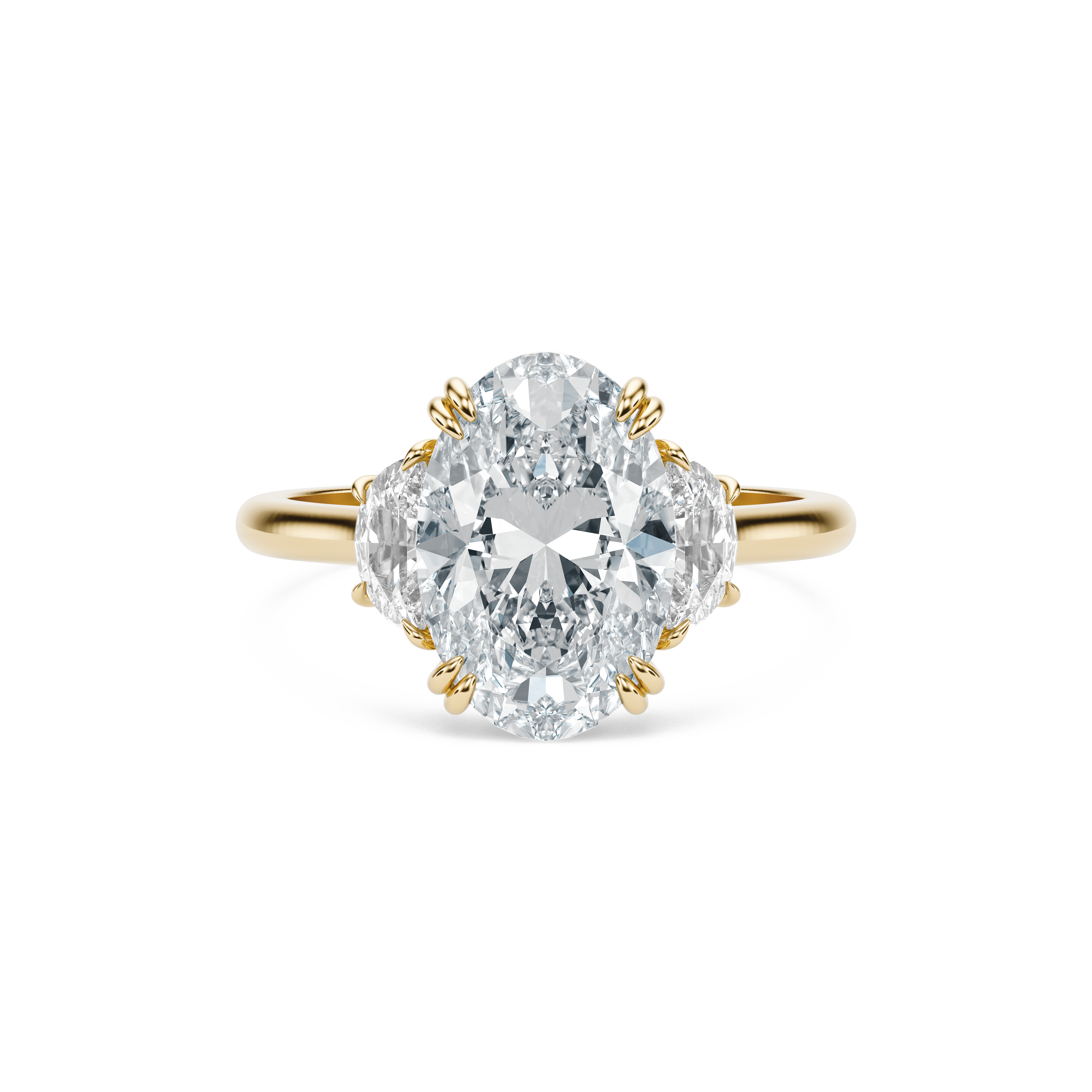 Halfmoon side stones are a client favorite choice for a three stone ring. This version of our Camilla Ring also comes standard with double claw prongs and a donut for added visual interest and structural integrity, which we always love to see. Please note that a donut will set the stone so low that a traditional wedding band won't be able to stack perfectly flush. Want the best of both worlds with a flush stack and a donut? Contact us about our open bands for a custom fit at hello@createdrings.com.