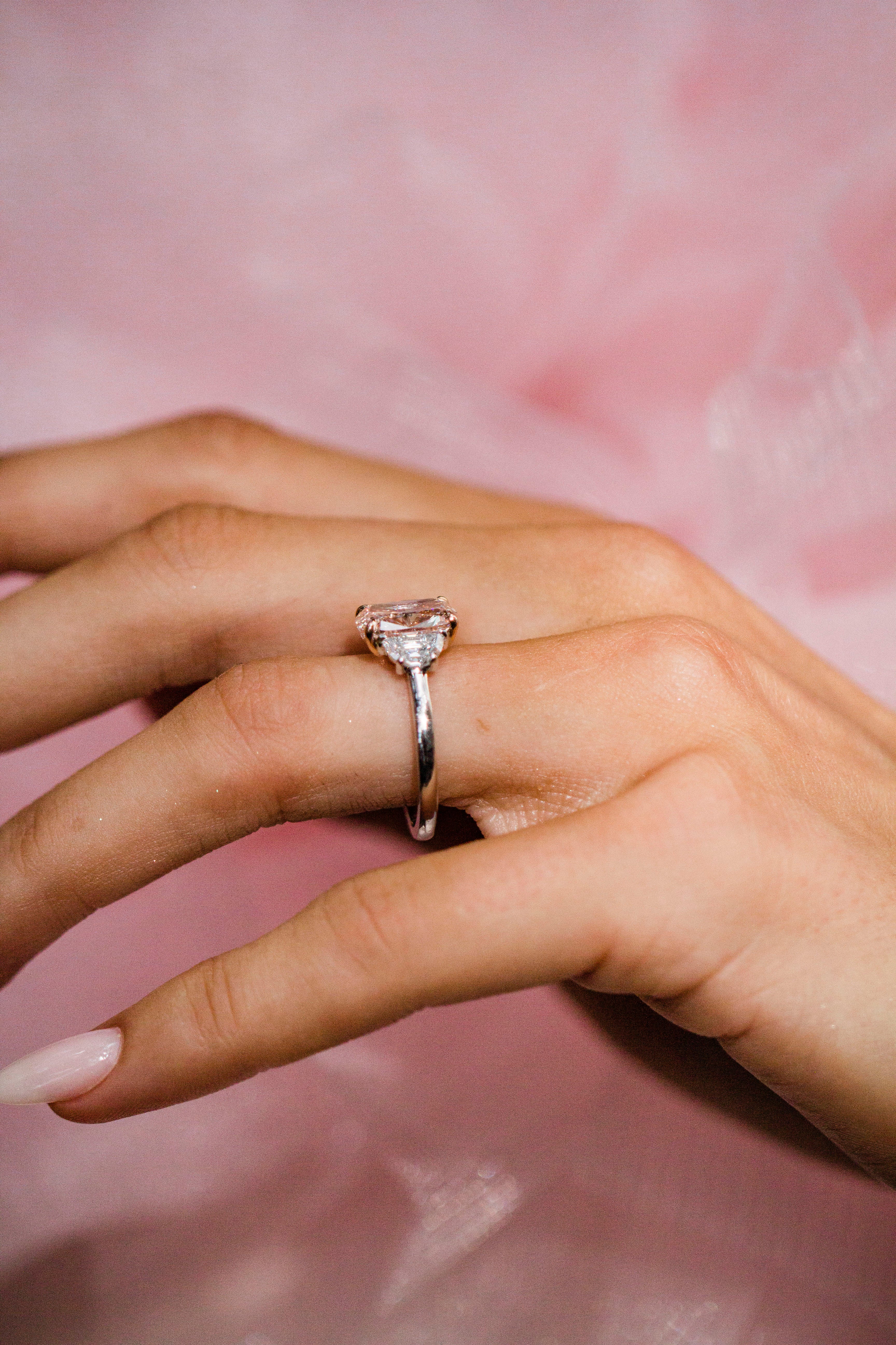 Perfect in pink, this 3.24 carat cushion Camilla with half-moon side stones is perfectly balanced. We think pink lab diamonds are a stellar value compared to their natural counterparts, and this piece is a perfect example of that. To top off the design, this piece is set in a two tone 14K rose and white gold setting, a complimenting metal combination that elevates and embraces the fancy vivid pink center. Please note that a donut will set the stone so low that a traditional wedding band won't be able to stack perfectly flush. Want the best of both worlds with a flush stack and a donut? Contact us about our open bands for a custom fit at hello@createdrings.com.