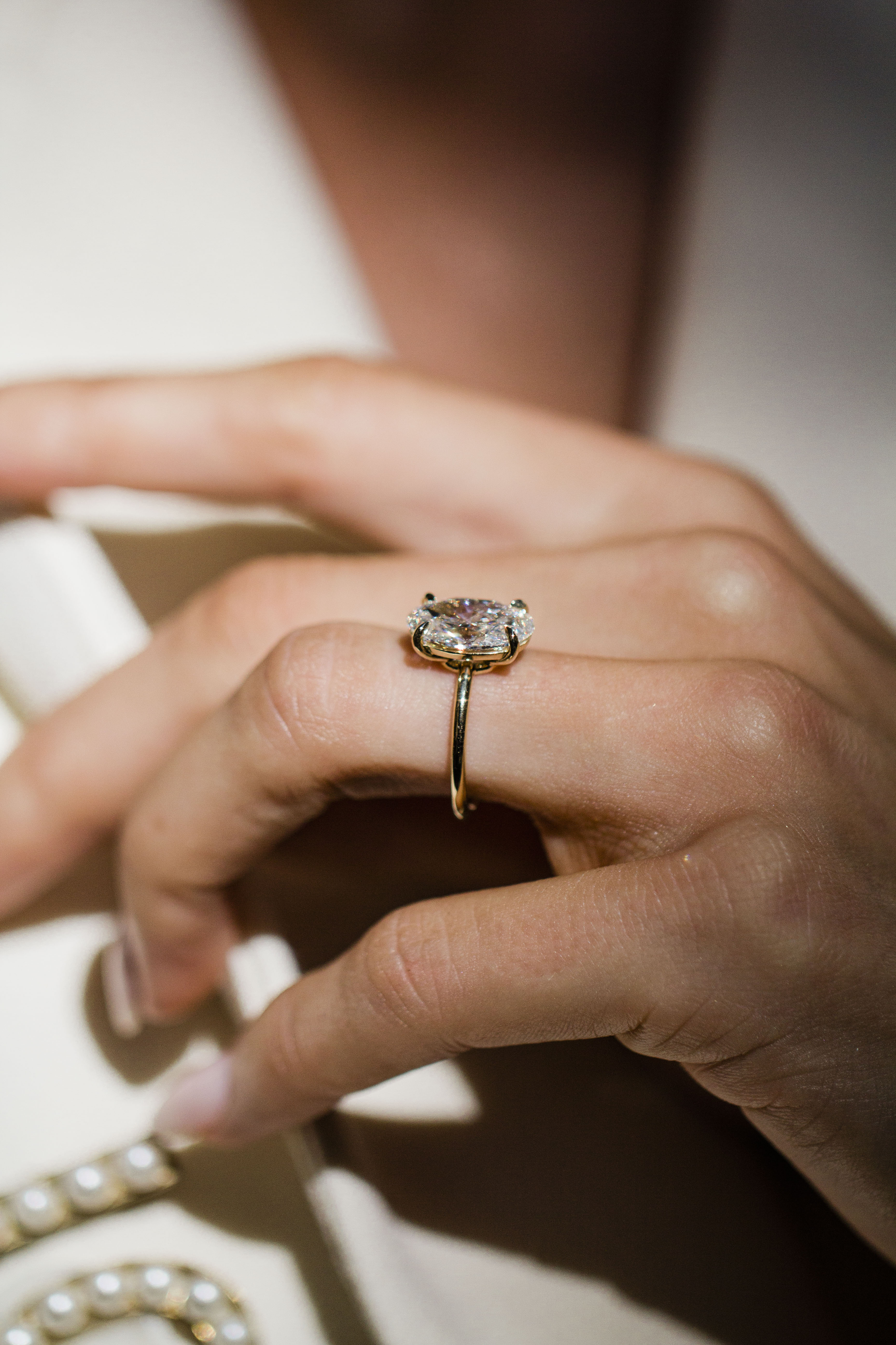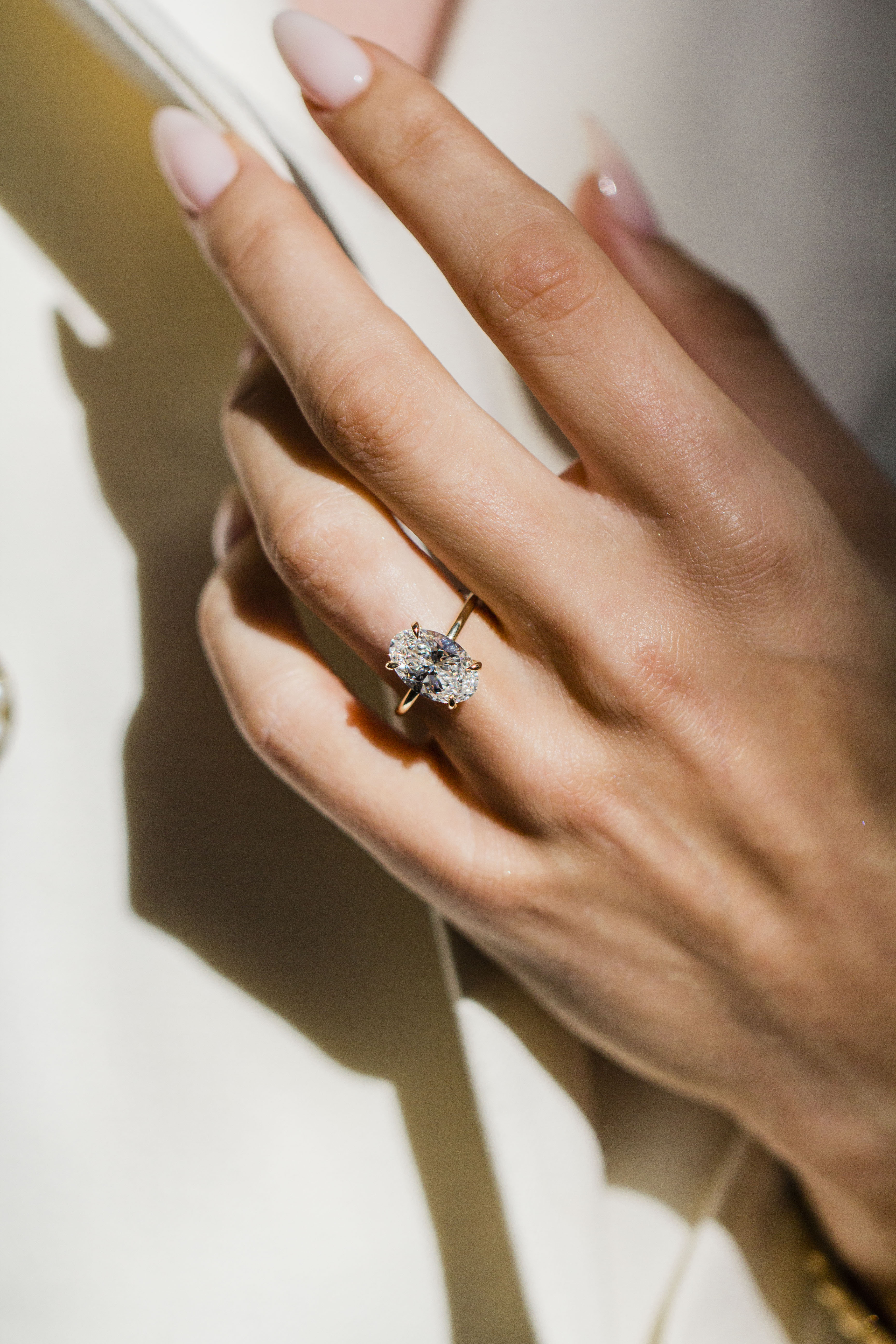This Harper piece features a stunning 3.02 carat oval brilliant set on a dainty 1.5mm solitaire band for an effortlessly timeless look. We added a donut for extra support and a super low-profile. Finished in 14K yellow gold with single claw prongs to keep the focus where it belongs, on that oval brilliant. Please note that a donut will set the stone so low that a traditional wedding band won't be able to stack perfectly flush. Want the best of both worlds with a flush stack and a donut? Contact us about our open bands for a custom fit at hello@createdrings.com.