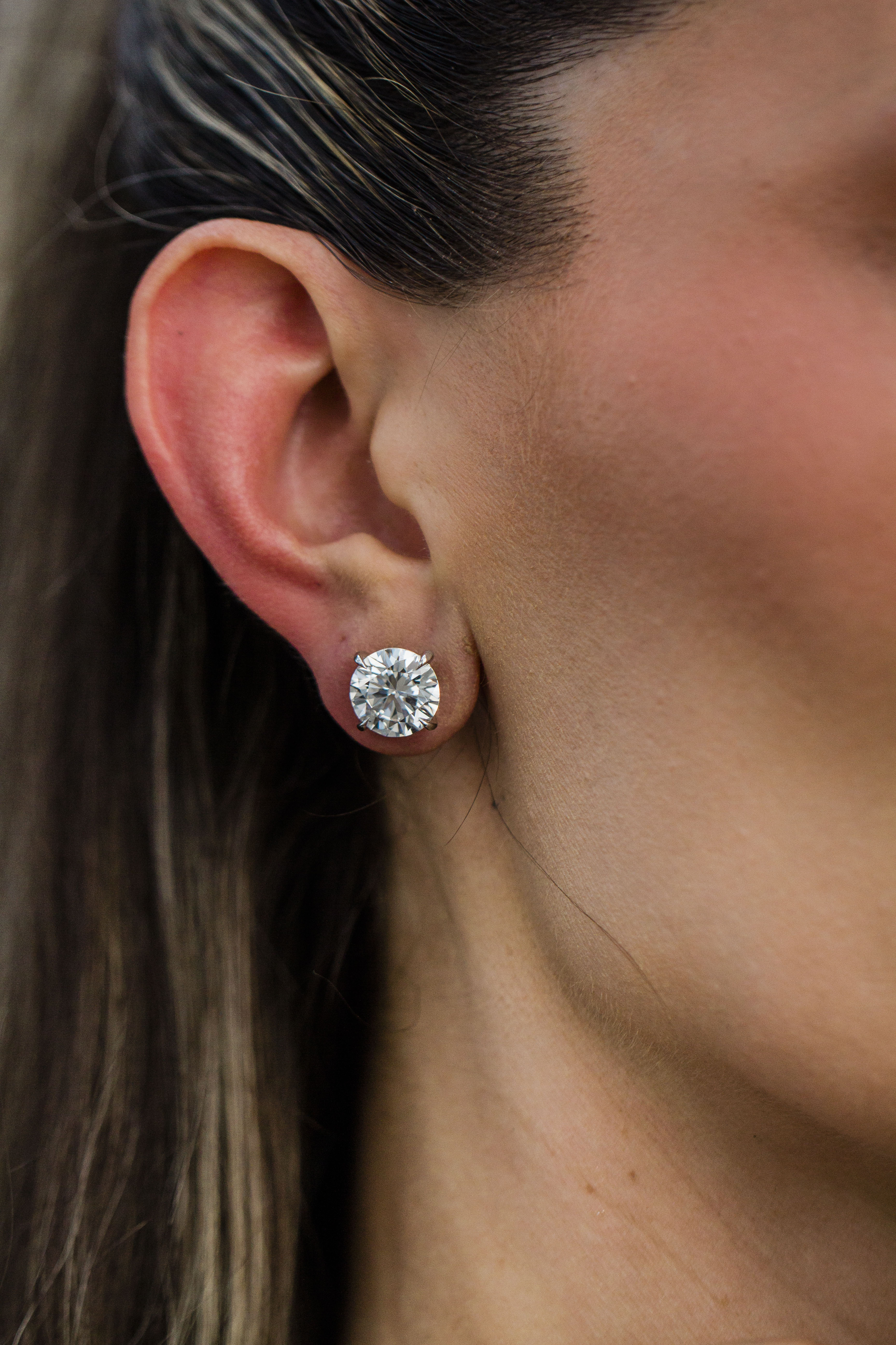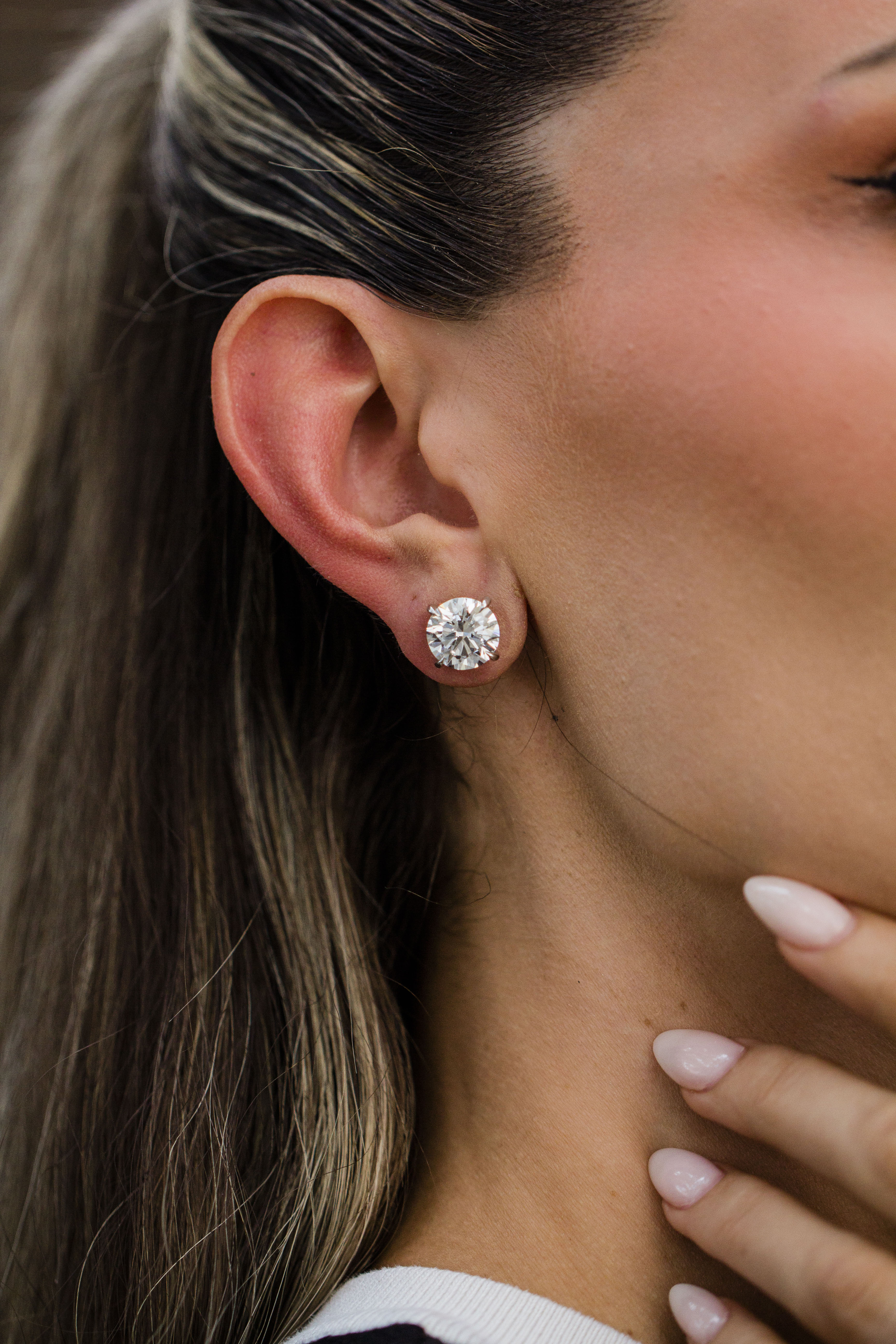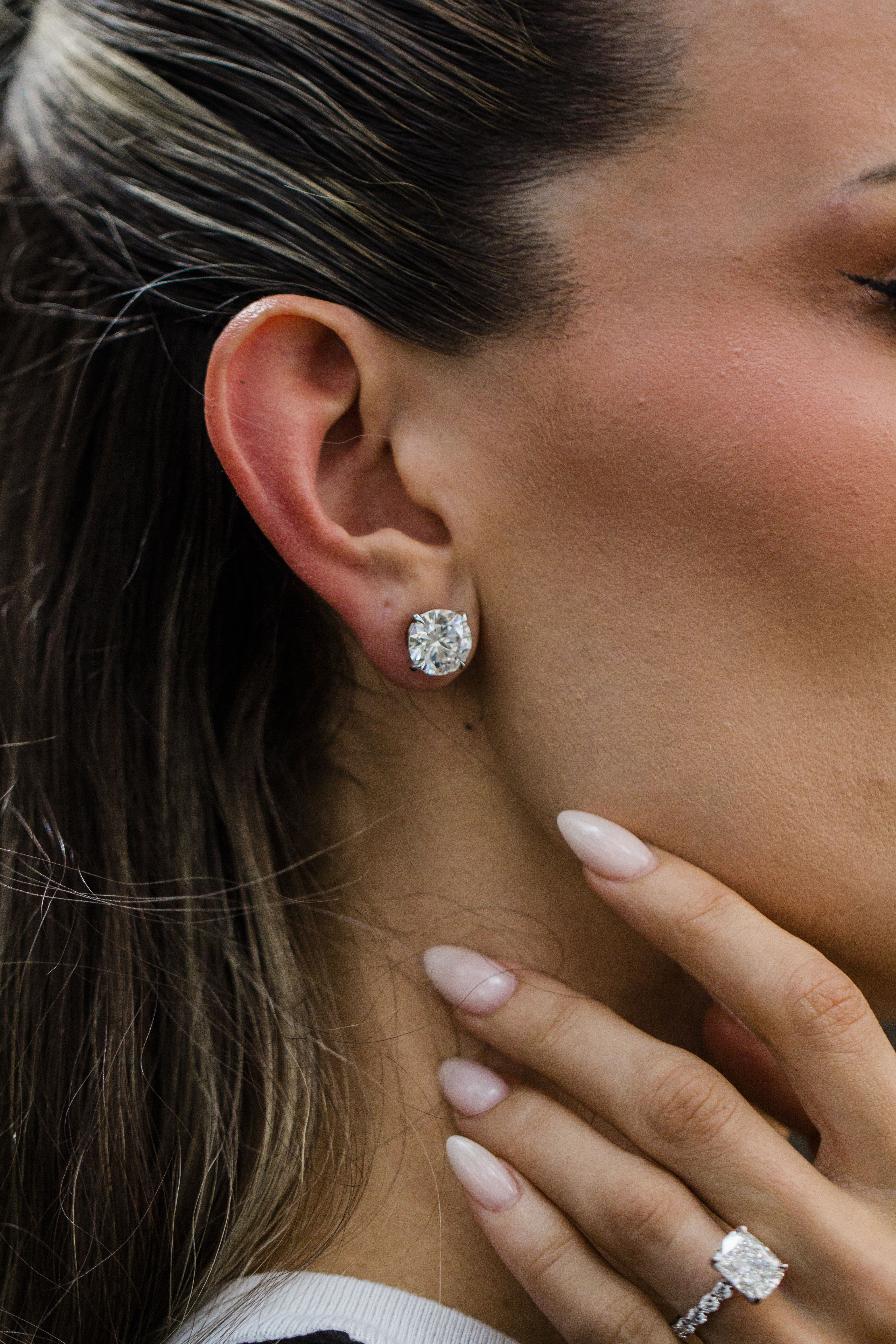 Although we're best known for our custom lab diamond rings, we also specialize in crafting lab diamond studs. This statement round pair totals 9.58 carats and is set with secure screw backs. A low-profile donut setting ensures the diamonds sit as close to the ear as possible, combining timeless elegance with everyday comfort. Please note, the studs do not come with an IGI certification. IGI certification is available upon request.