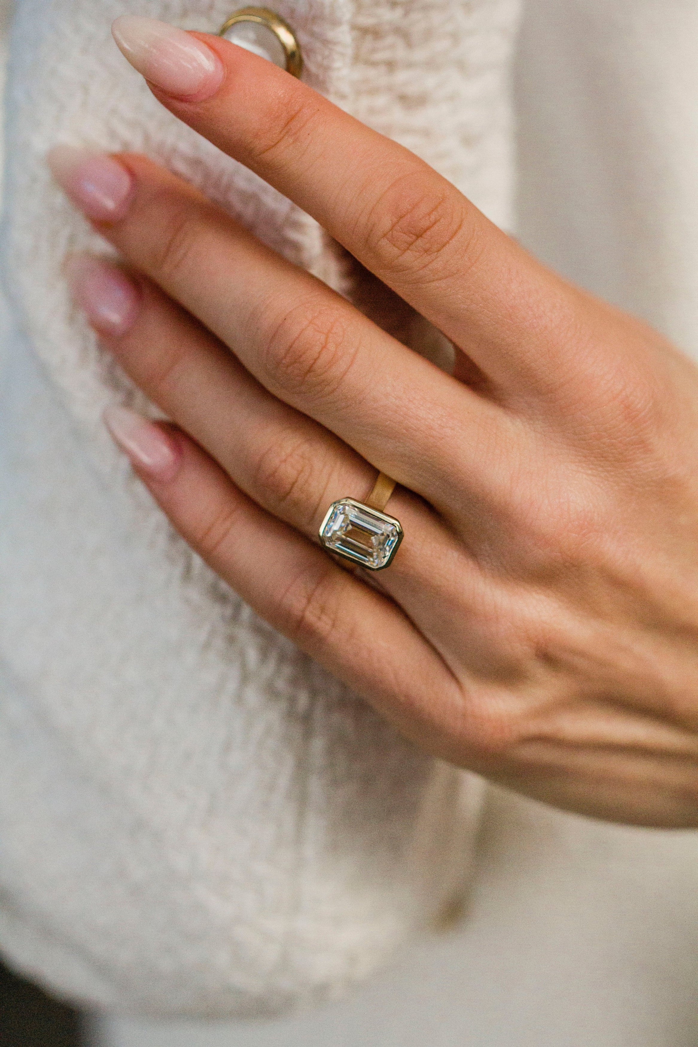 Designed with clean, modern lines, this Luna ring features a 4.04 carat emerald-cut diamond set in 14K yellow gold and secured within our signature bezel. This style also includes a donut and cathedral for added support, keeping the center stone beautifully anchored for everyday wear. Please note that this setting sits lower on the finger, so most traditional wedding bands will not sit perfectly flush. If you’re looking for a flush stack, contact us about our custom open band options at hello@createdrings.com.