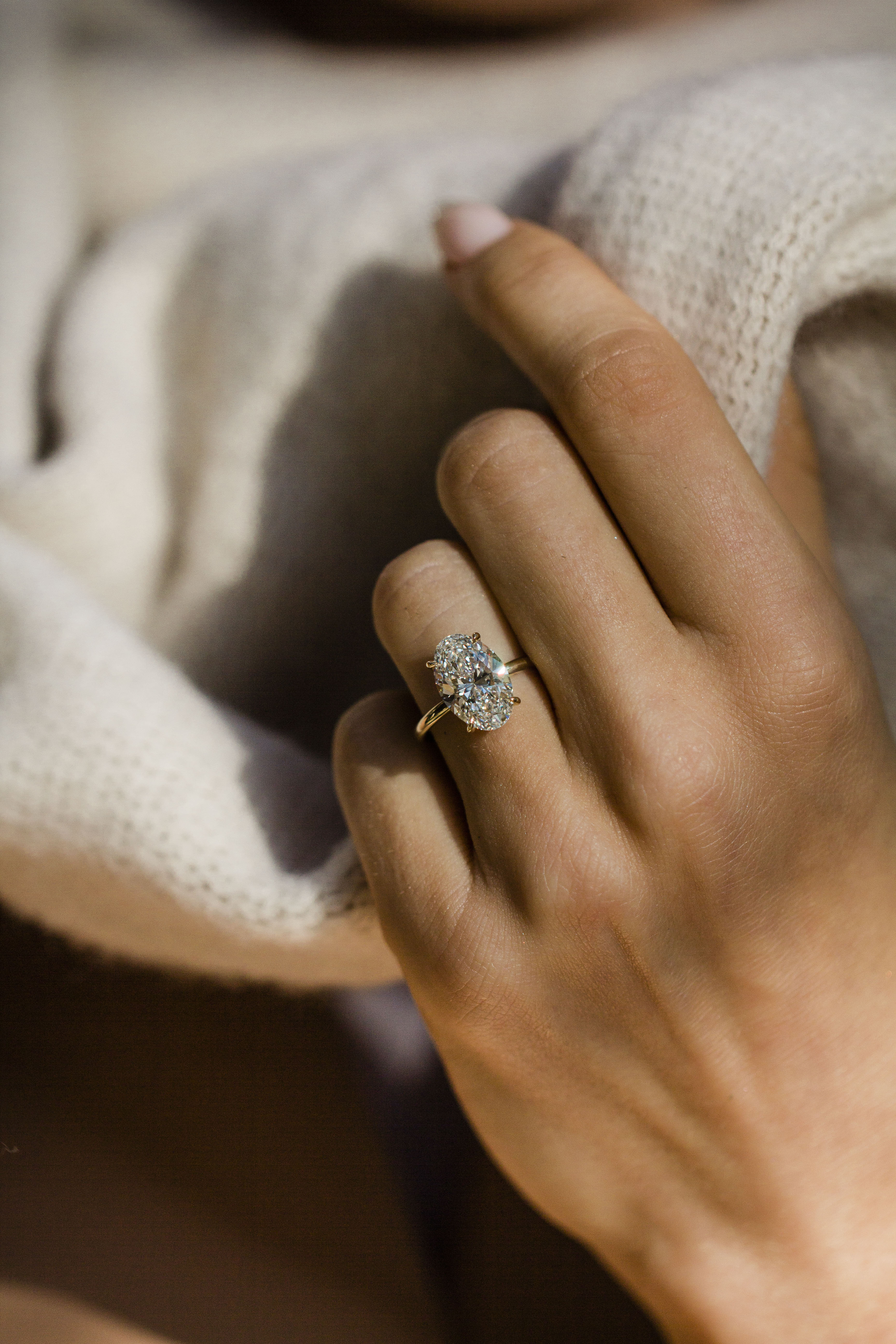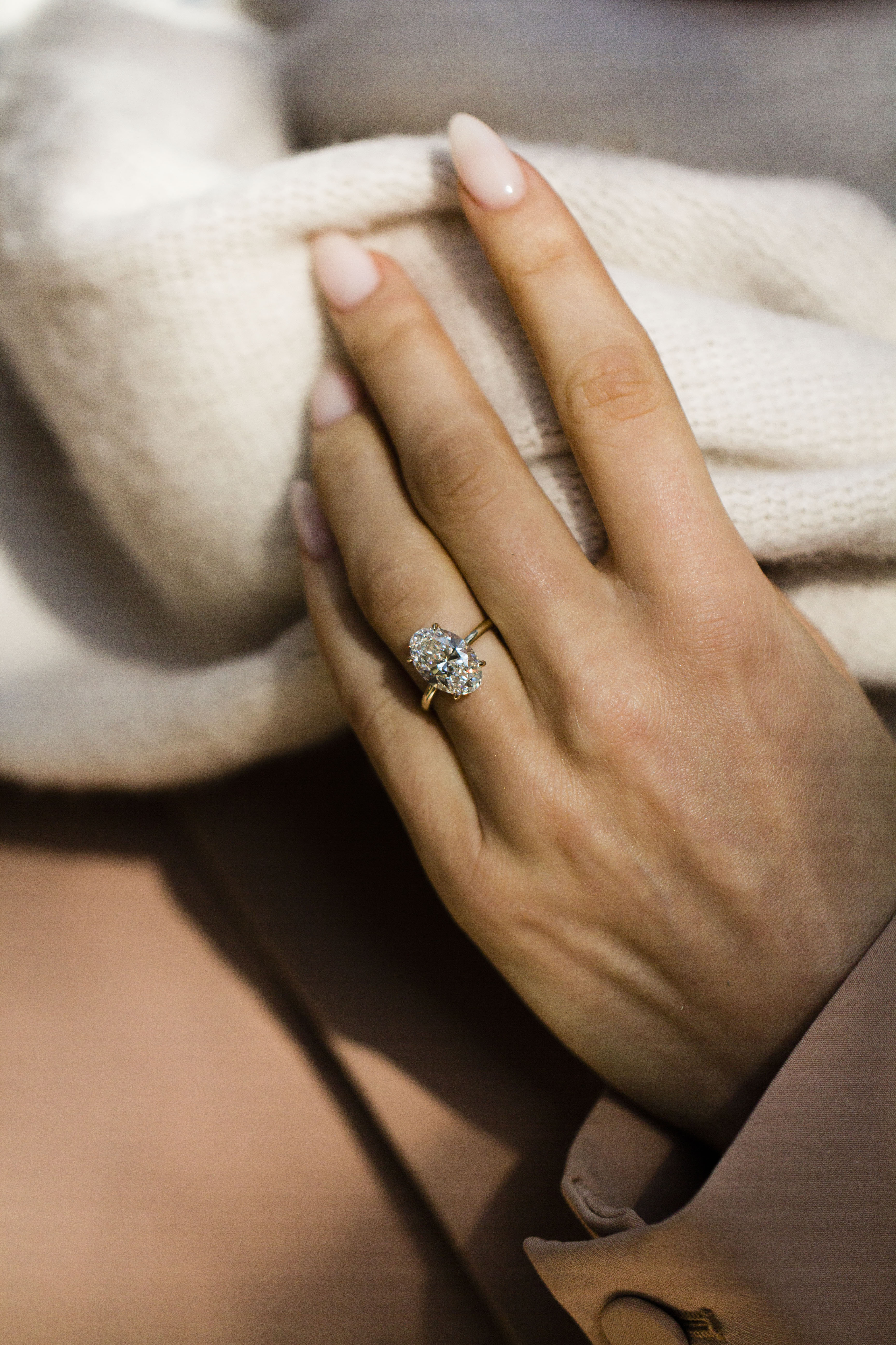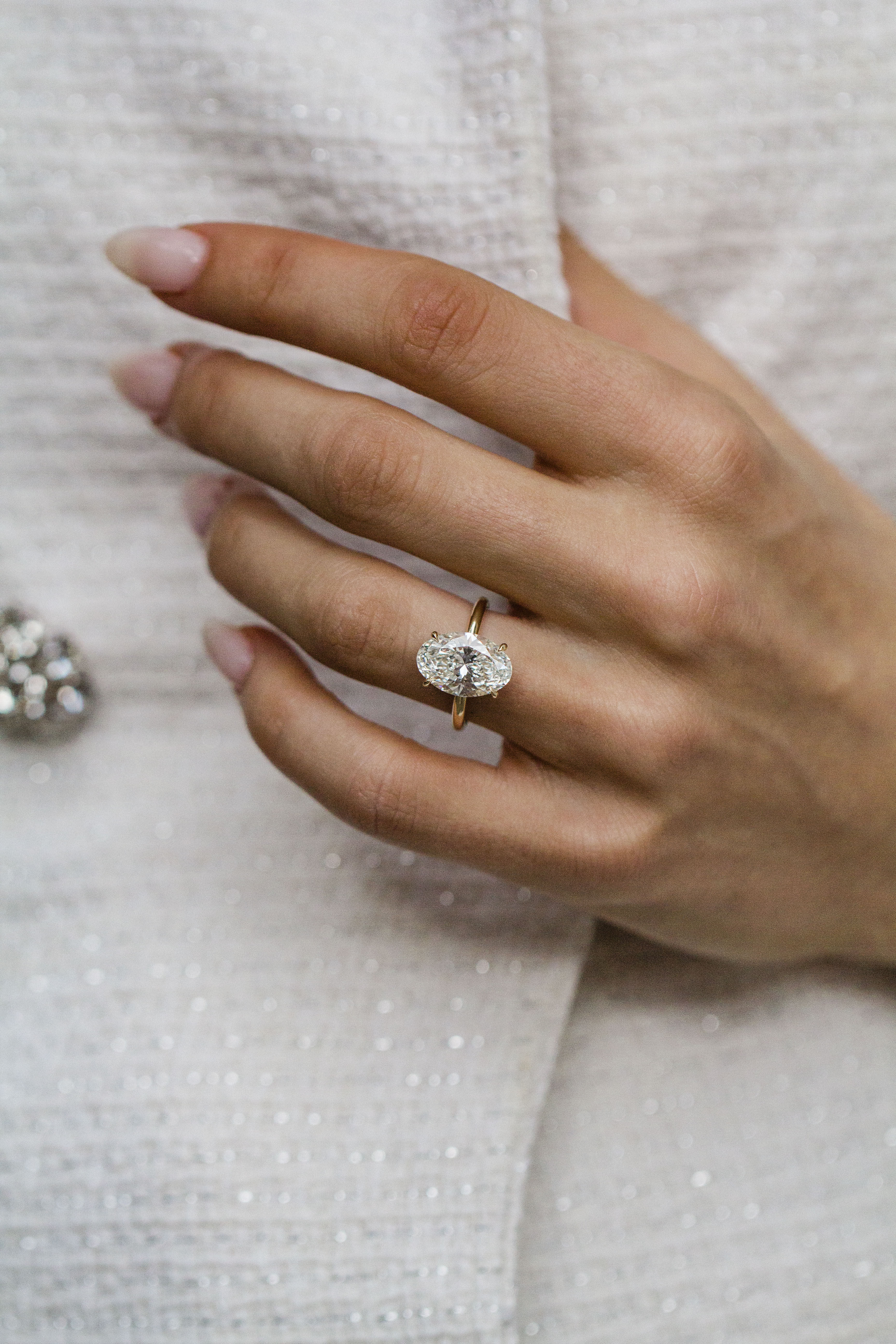 A timeless classic, our 3.77 carat oval brilliant lab created diamond Harper ring! Set entirely in 14K yellow gold, this setting showcases a 1.8mm solitaire band, single claw prongs and a donut to sit low to the finger. Please note that a donut will set the stone so low that a traditional wedding band won't be able to stack perfectly flush. Want the best of both worlds with a flush stack and a donut? Contact us about our open bands for a custom fit at hello@createdrings.com.