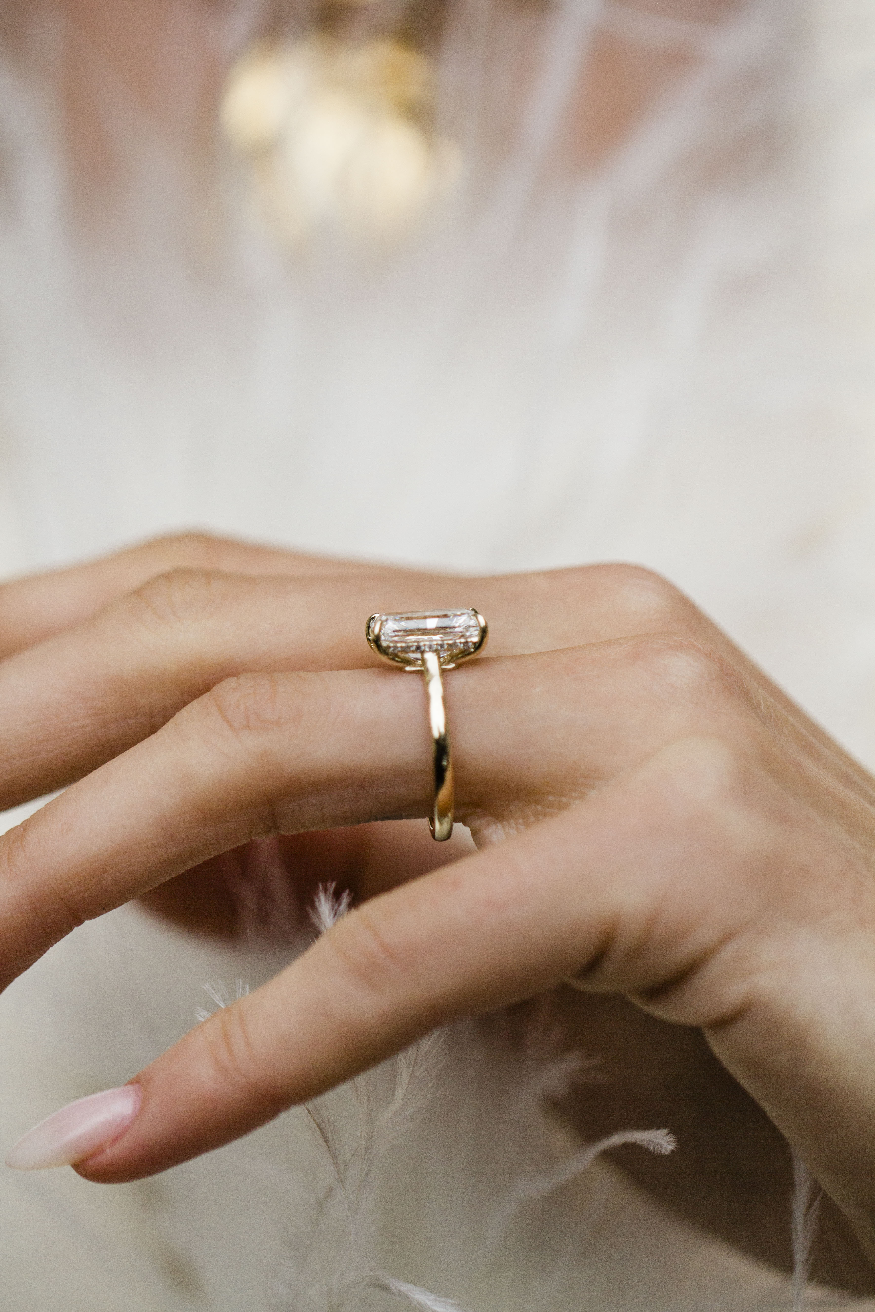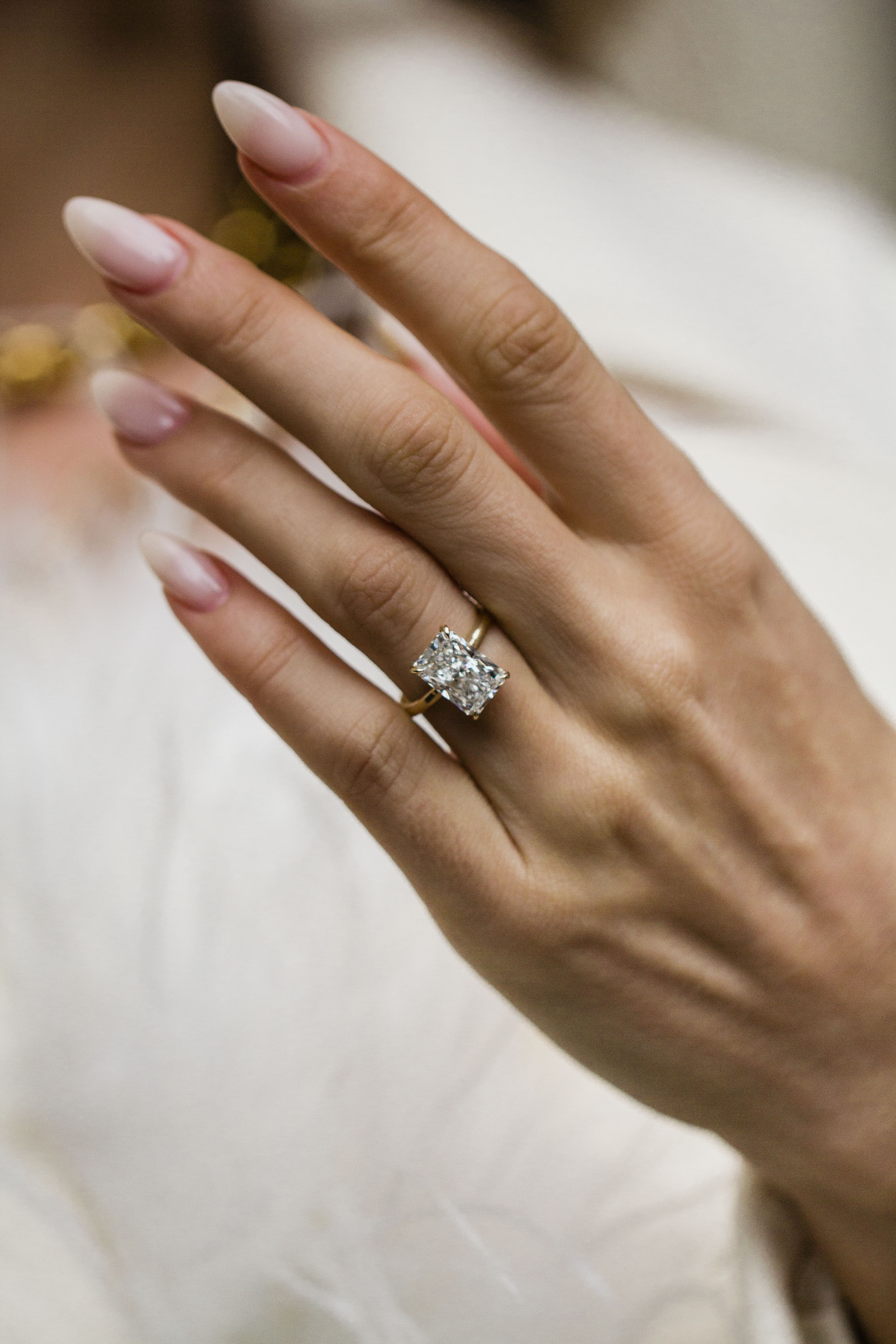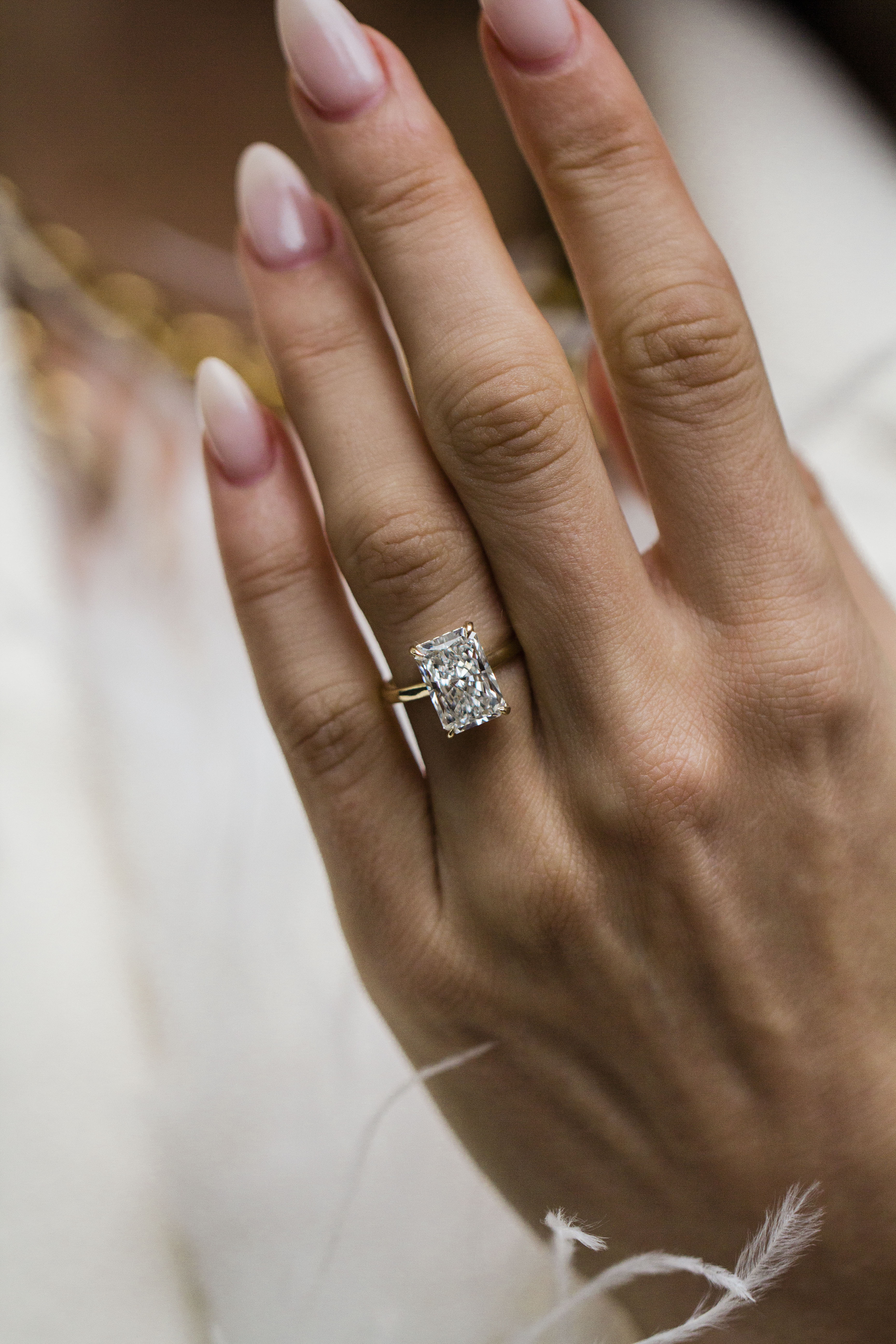 This Harper showcases a 3.84 carat, elongated modified brilliant radiant lab created diamond center stone. Set completely in 14K yellow gold, this ring features a 1.8mm solitaire band, donut, cathedral, single claw prongs and an invisible halo for added sparkle. Please note that a donut will set the stone so low that a traditional wedding band won't be able to stack perfectly flush. Want the best of both worlds with a flush stack and a donut? Contact us about our open bands for a custom fit at hello@createdrings.com.