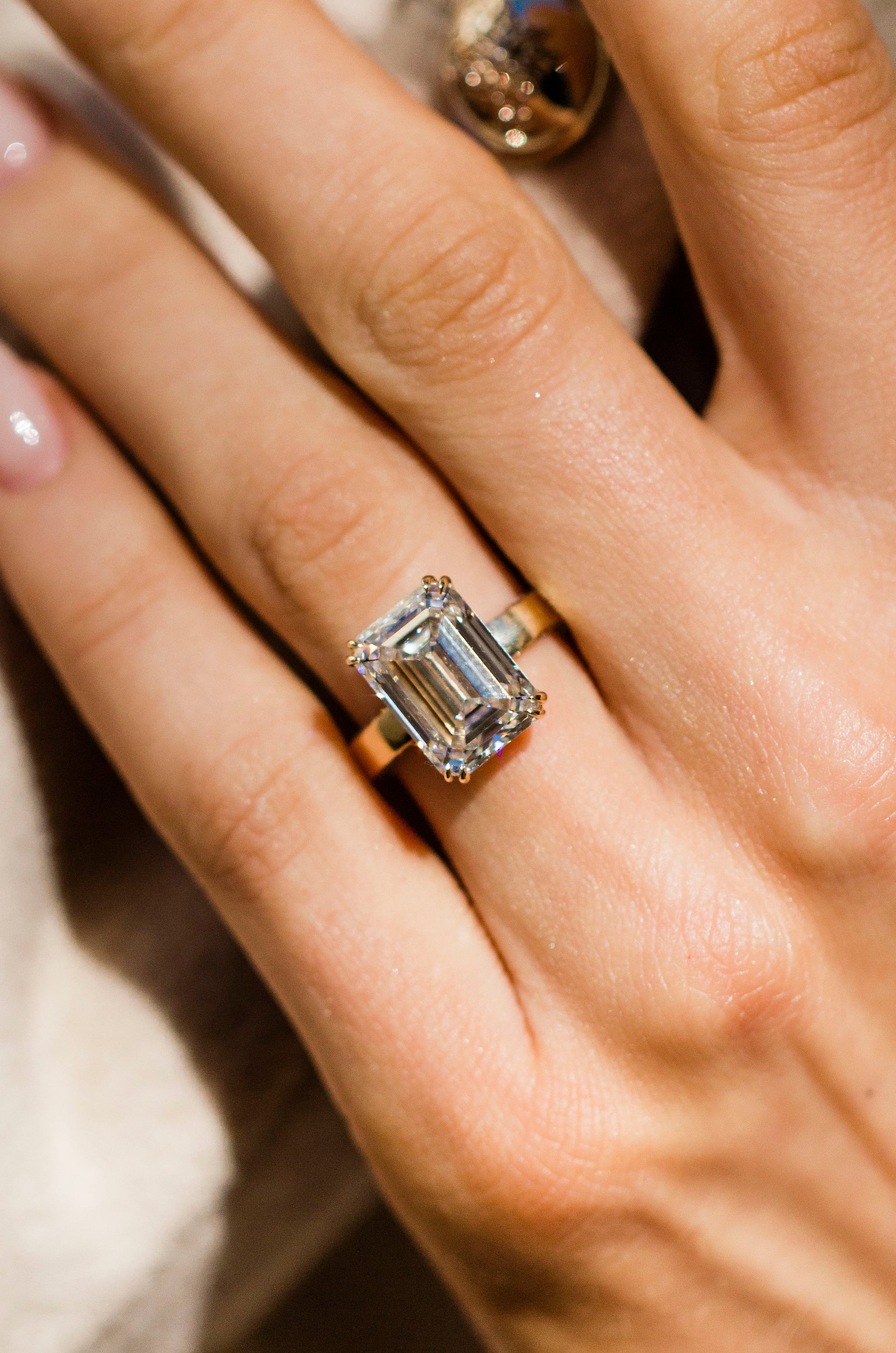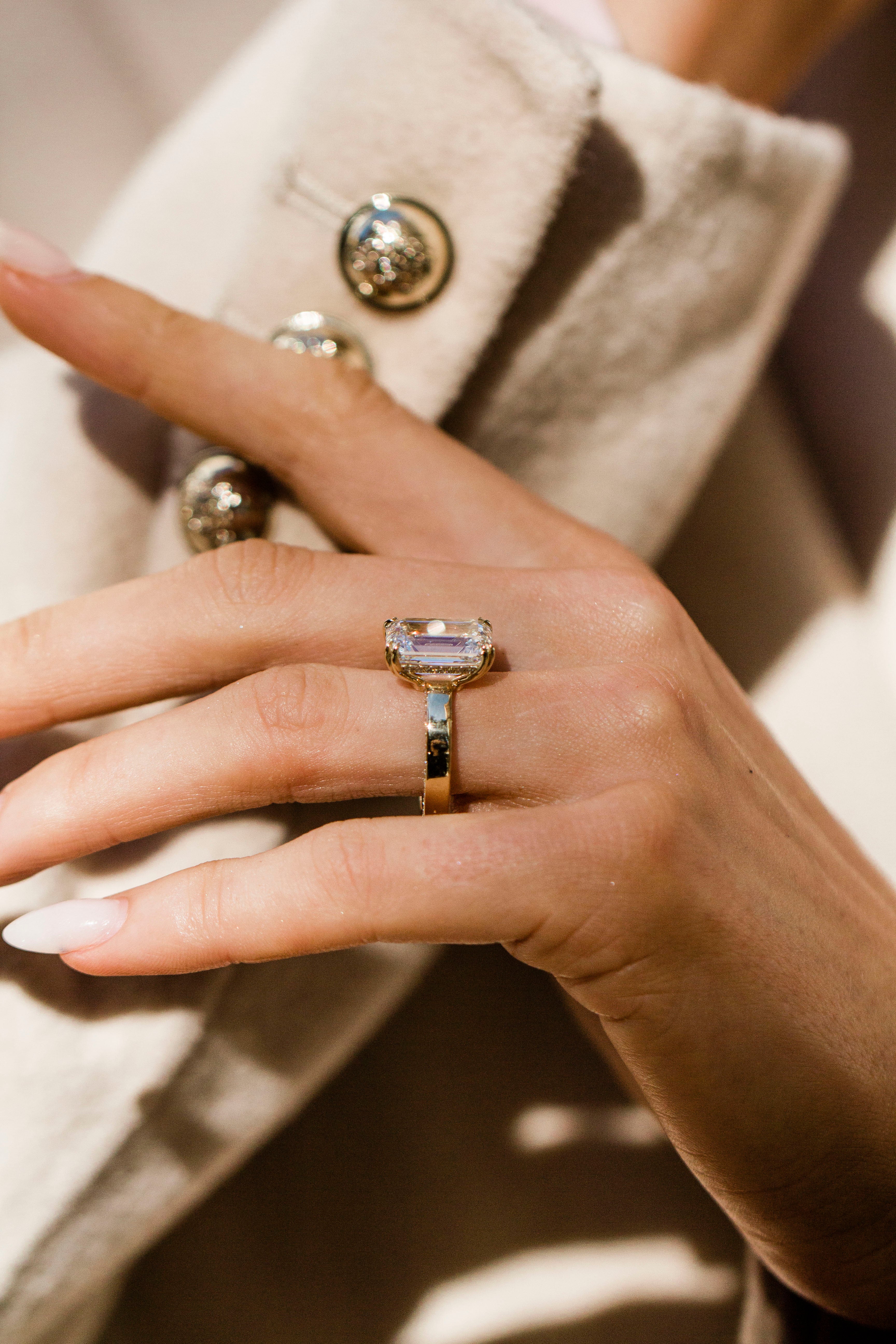 The design that combines everything you love about our Mercer setting, but with the hidden pavé of the Peyton. This one with a statement 6.96 carat (F, VVS2) emerald center set on a 3.2mm flat solitaire band with pavé sides. Finished with a donut, double claw prongs and an invisible halo for a touch more hidden pavé.
