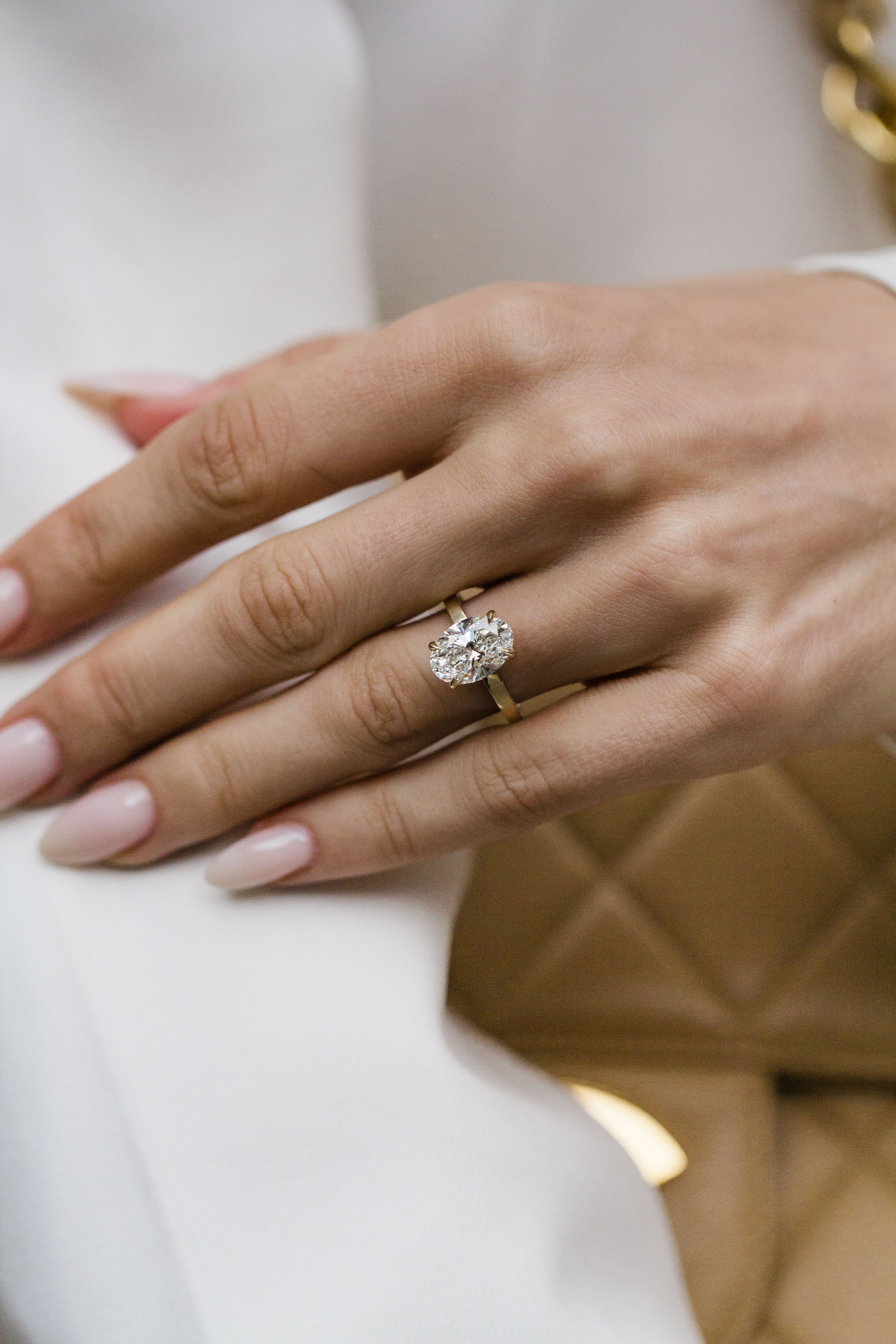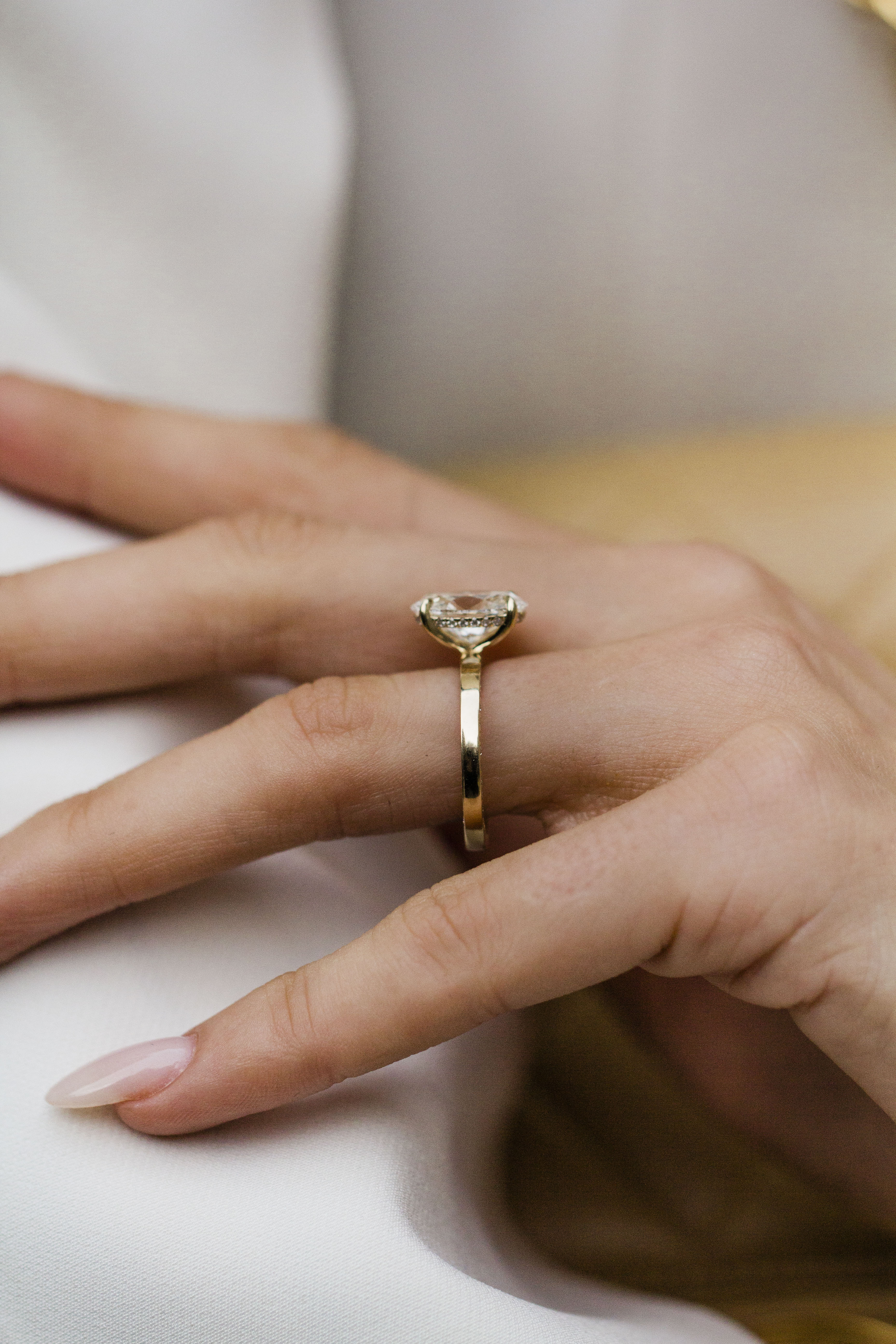 This 2.87 carat oval engagement ring is set in our Peyton setting, designed to feel both polished and feminine. The oval center stone is secured with single claw prongs and accented by an invisible halo that subtly enhances its size and brilliance. A 2mm squared-off 14K yellow gold band features delicate micropavé side detailing for added sparkle, while a sizing bar at the base provides a secure fit to prevent the ring from spinning on your finger.