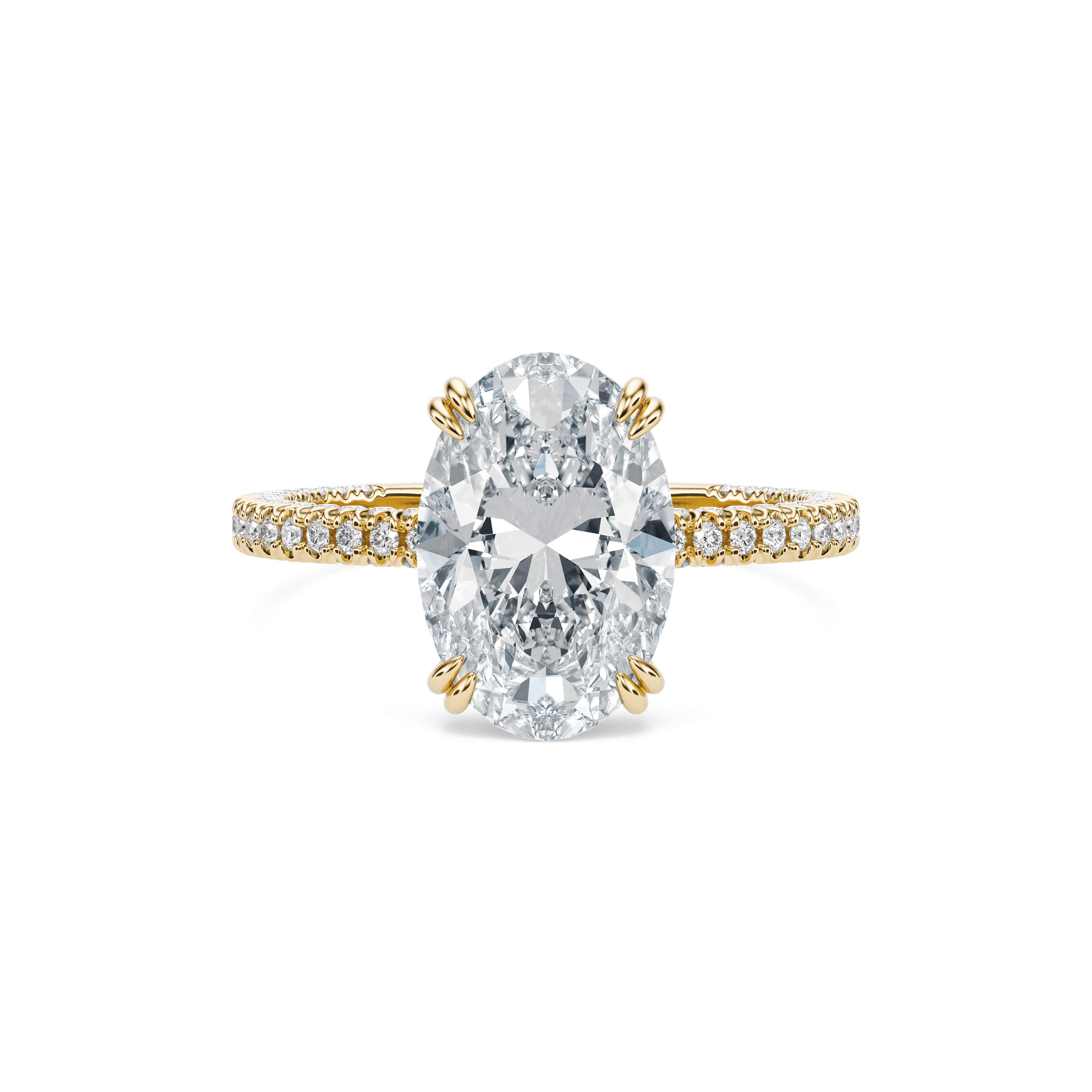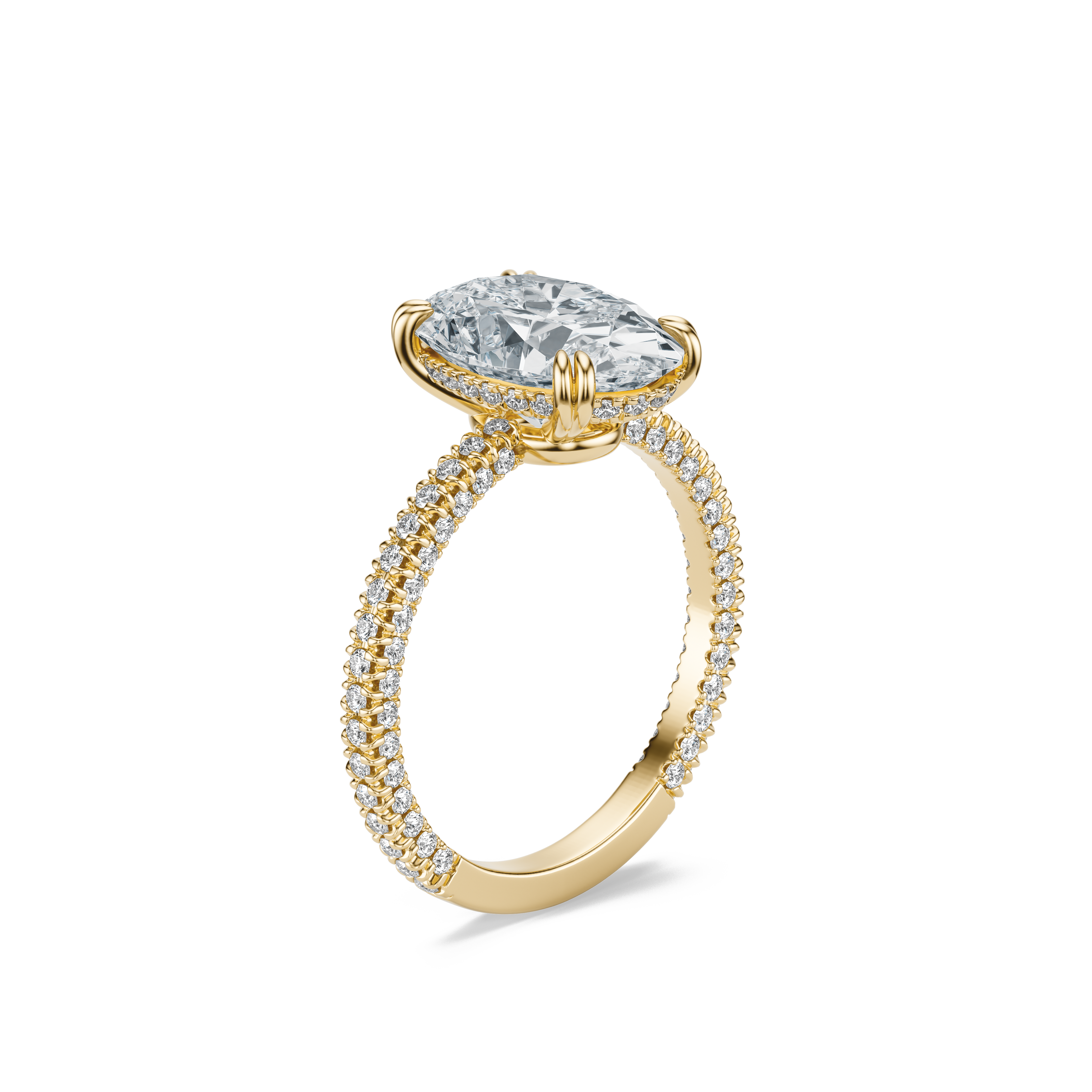 Our Founder Recommended Rowan Ring features our signature triple micropavé that surrounds all three sides of the band in pavé stones. This version also includes double claw prongs, an invisible halo, and a donut for added structural integrity. Please note that a donut will set the stone so low that a traditional wedding band won't be able to stack perfectly flush. Want the best of both worlds with a flush stack and a donut? Contact us about our open bands for a custom fit at hello@createdrings.com.