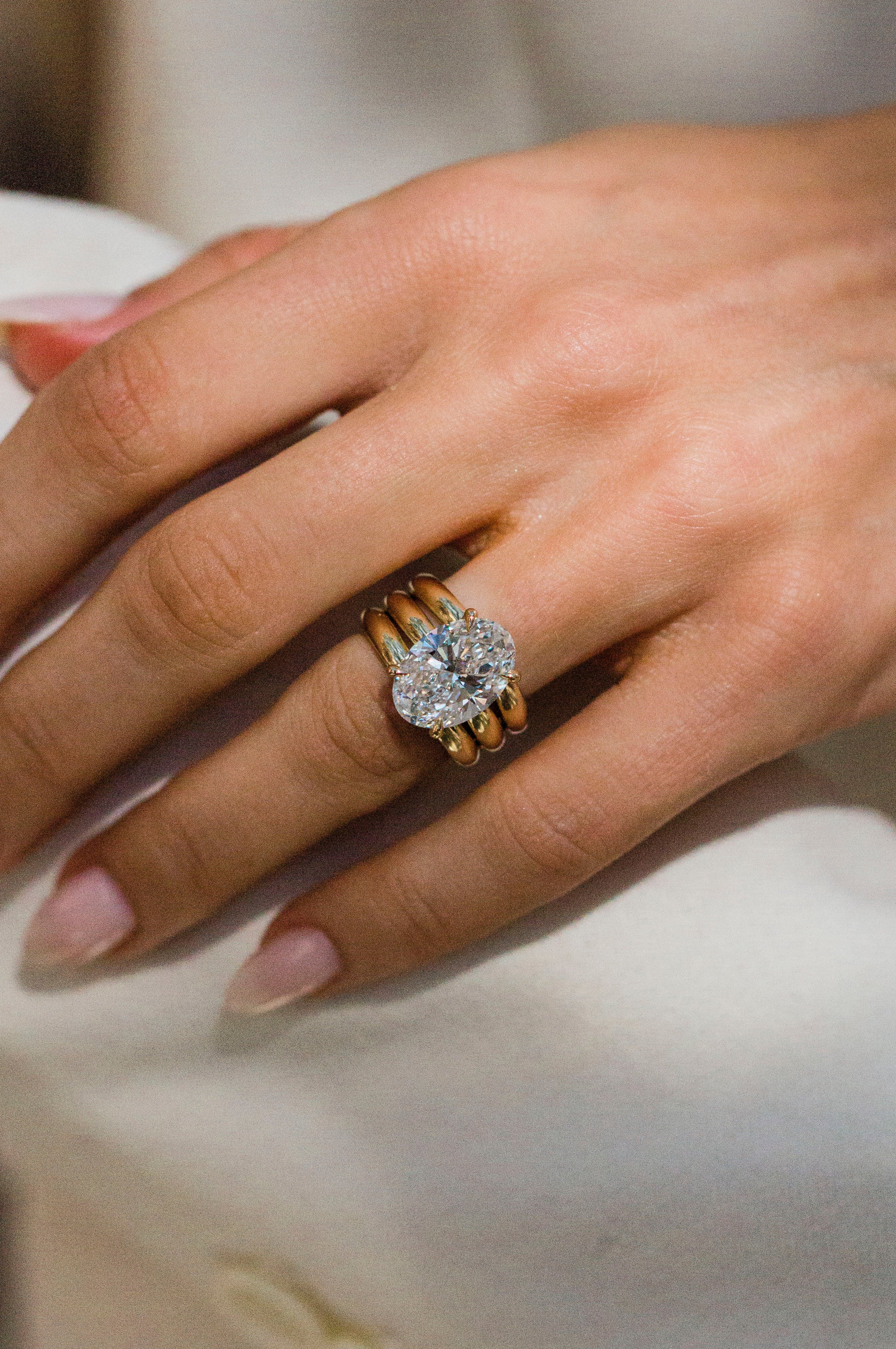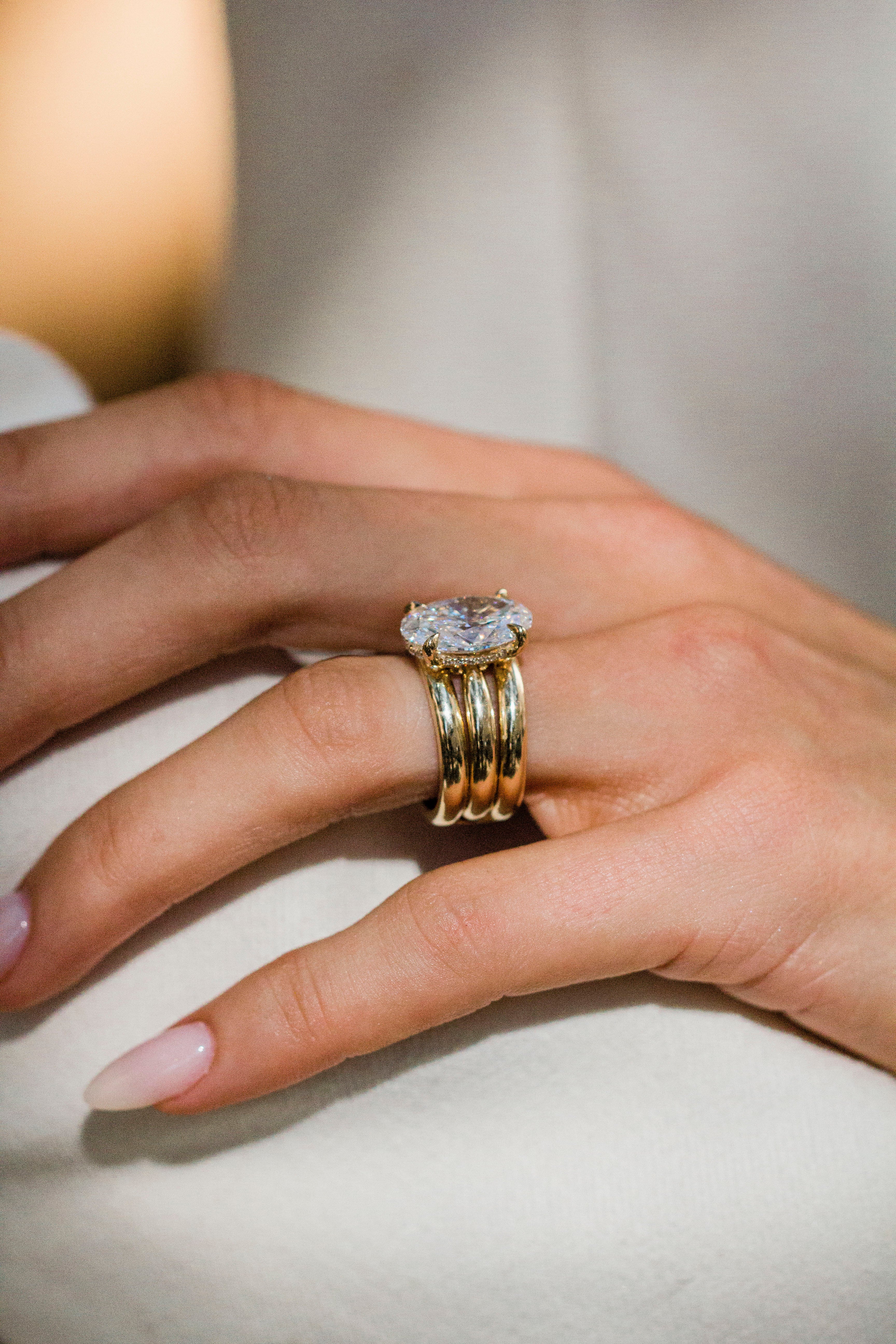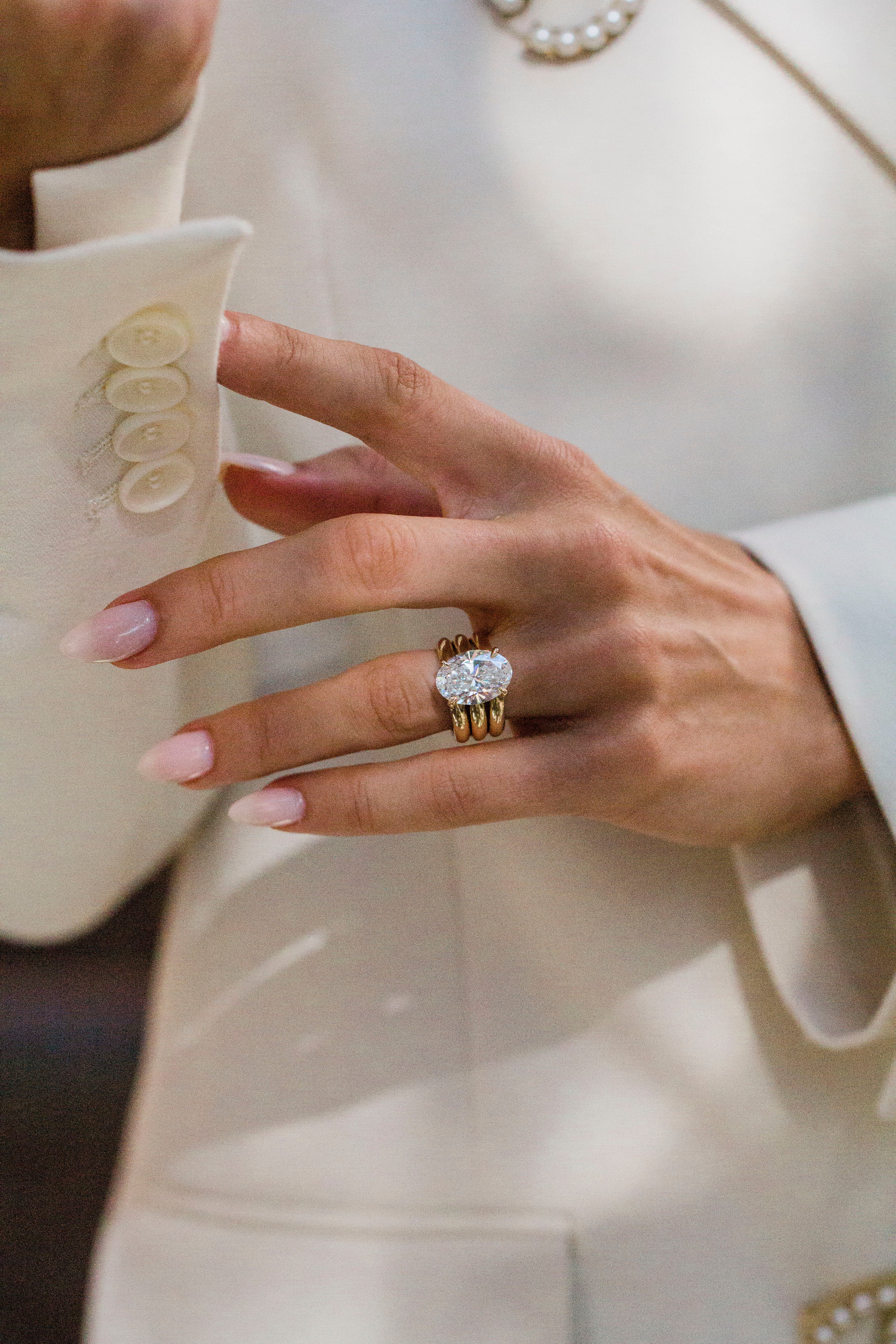 Where vibes, versatility, and function meet — introducing the Scottie. Our Scottie ring and band combo is designed to “click” together, so you’re not locked into one look. Instead, it can stand alone as a solitaire or together as a triple stacking piece. Our first version of this new signature style features a 5.04 carat oval center (E, VVS2). Please note the ring and band are sold as a set.
