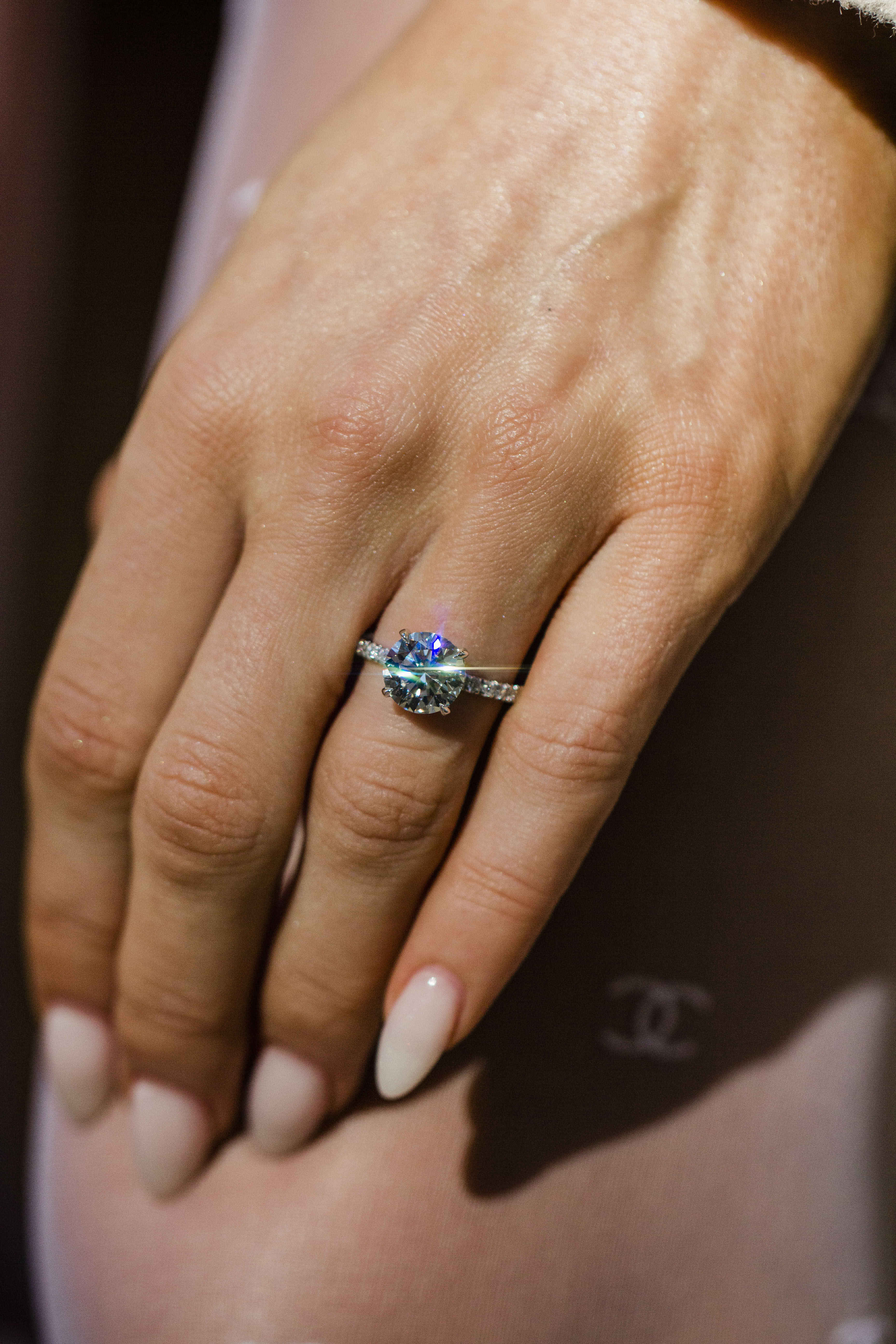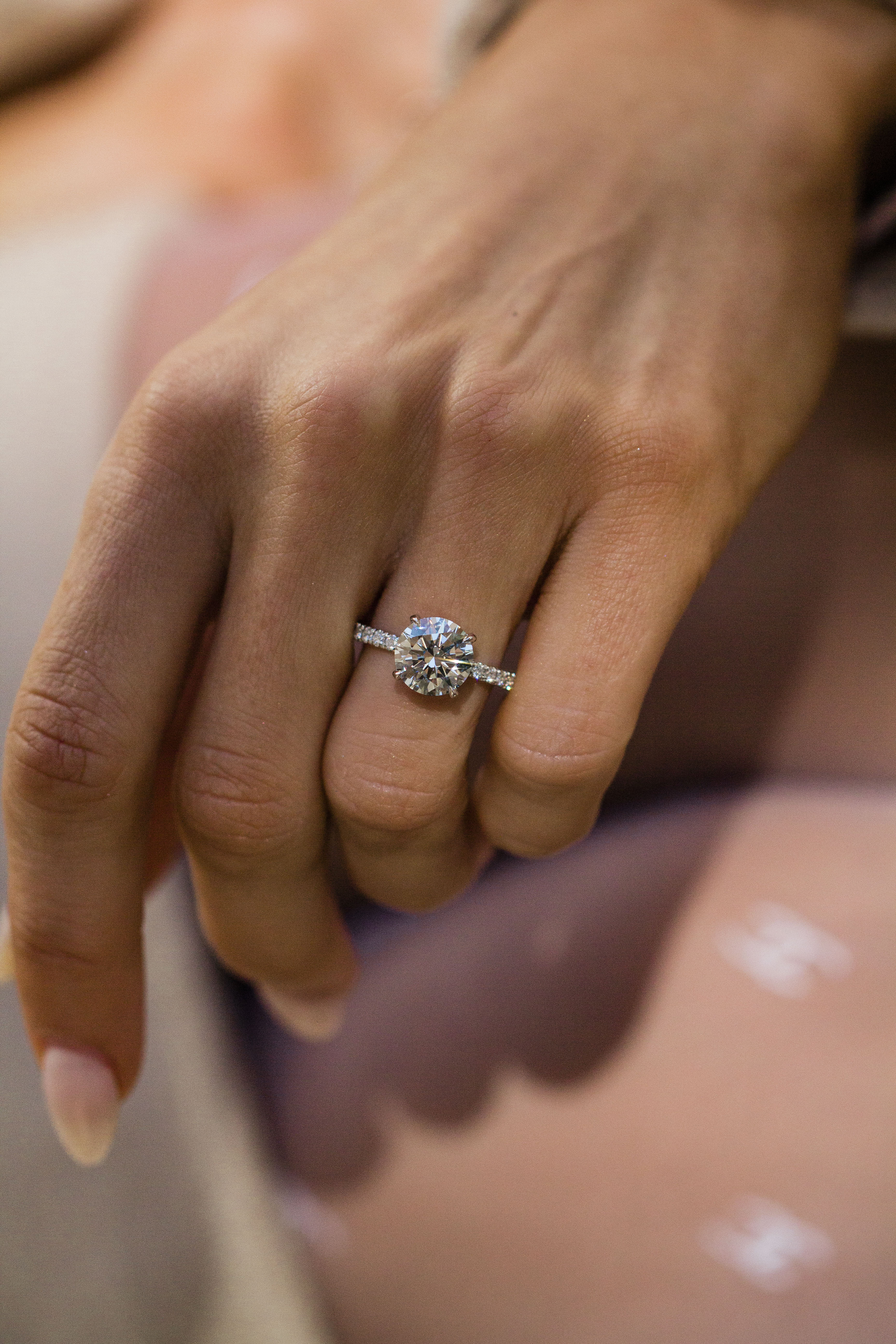 This 2.52 carat round brilliant solitaire is set in our Serena ring, designed to balance delicate detail with everyday durability. The center stone is secured with single claw prongs and reinforced with a supportive donut, while an invisible halo subtly enhances the overall presence of the stone. The 1.8mm U-prong pavé shank and pavé underside add refined sparkle from every angle, all finished in 14K white gold for a clean, modern look.