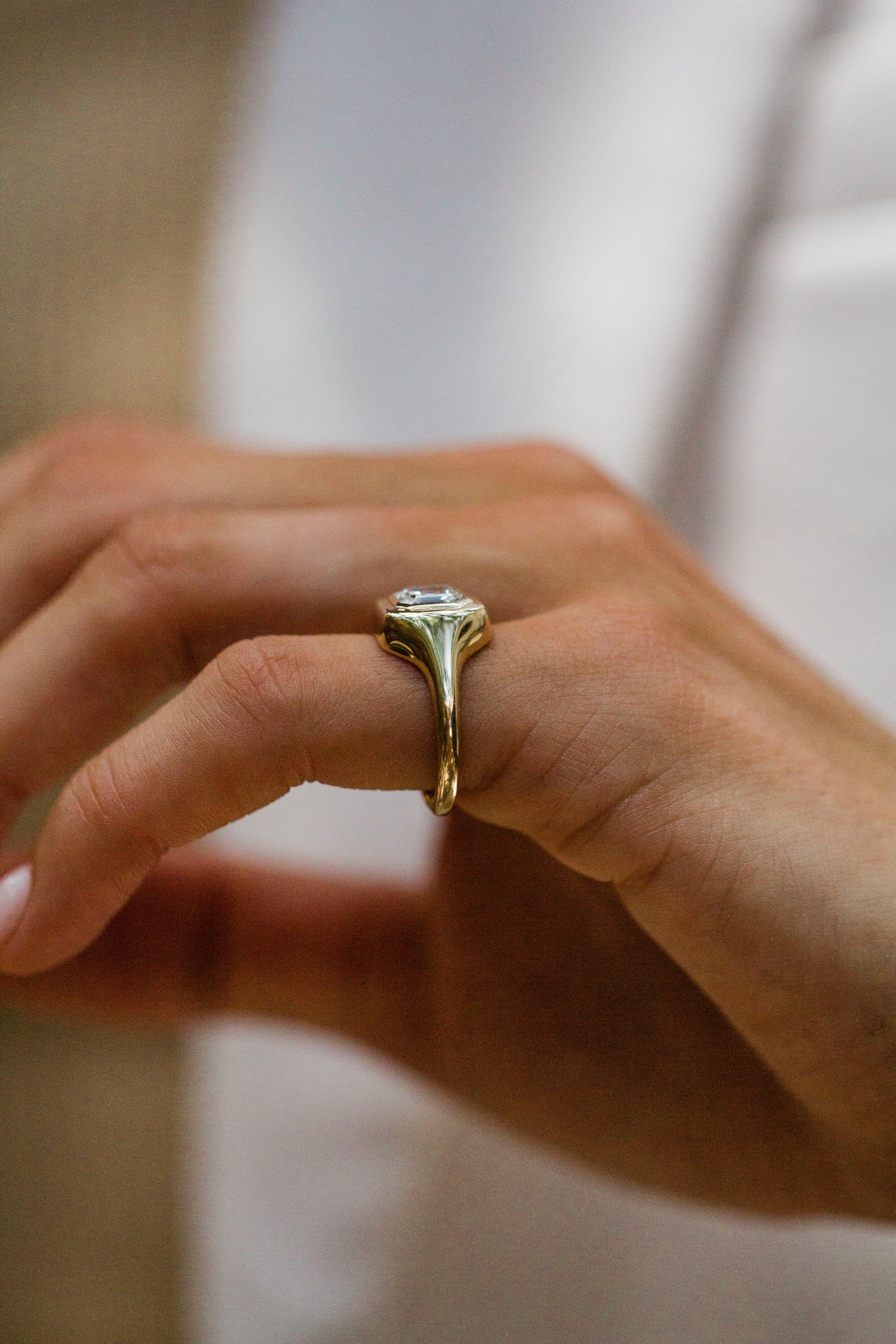 This Signature Signet is centered with a 1.47 carat asscher for balanced symmetry and crisp finishes. Set in a 3m to 2mm tapered solitaire band, the piece is cast in 14K yellow gold for a refined finish.
