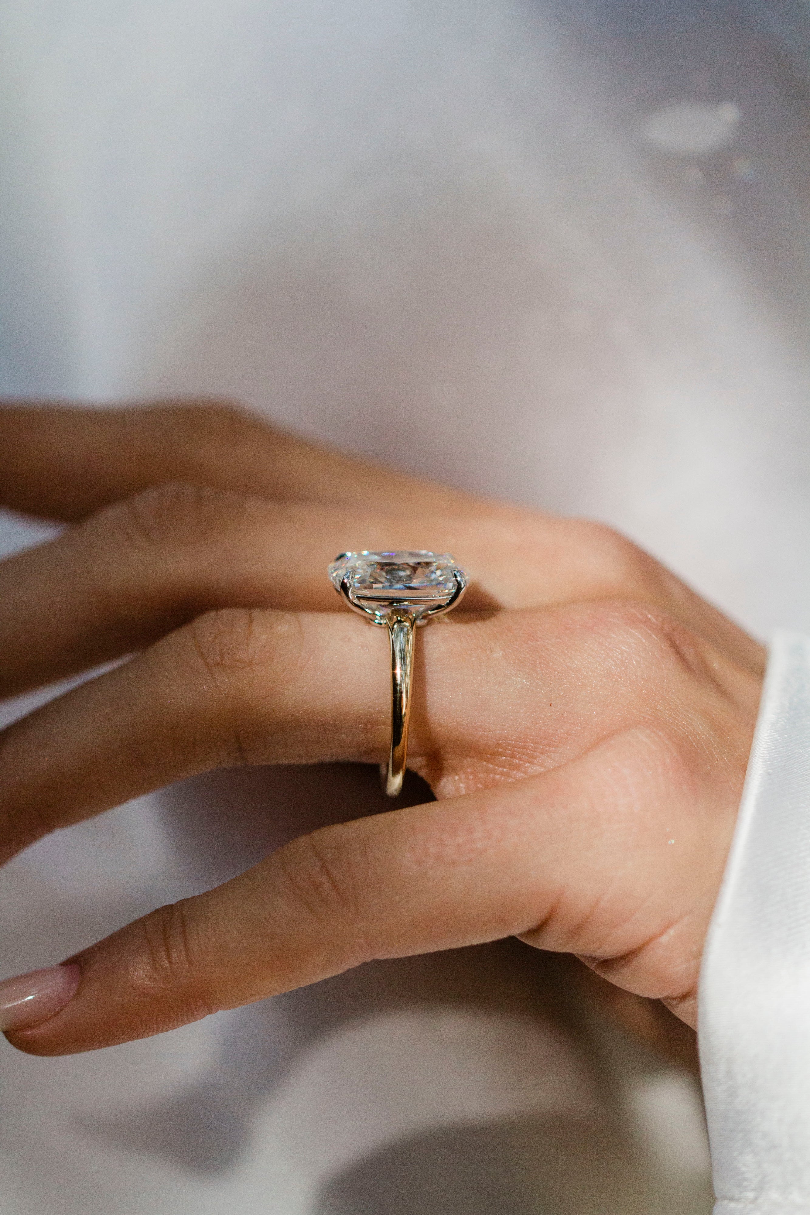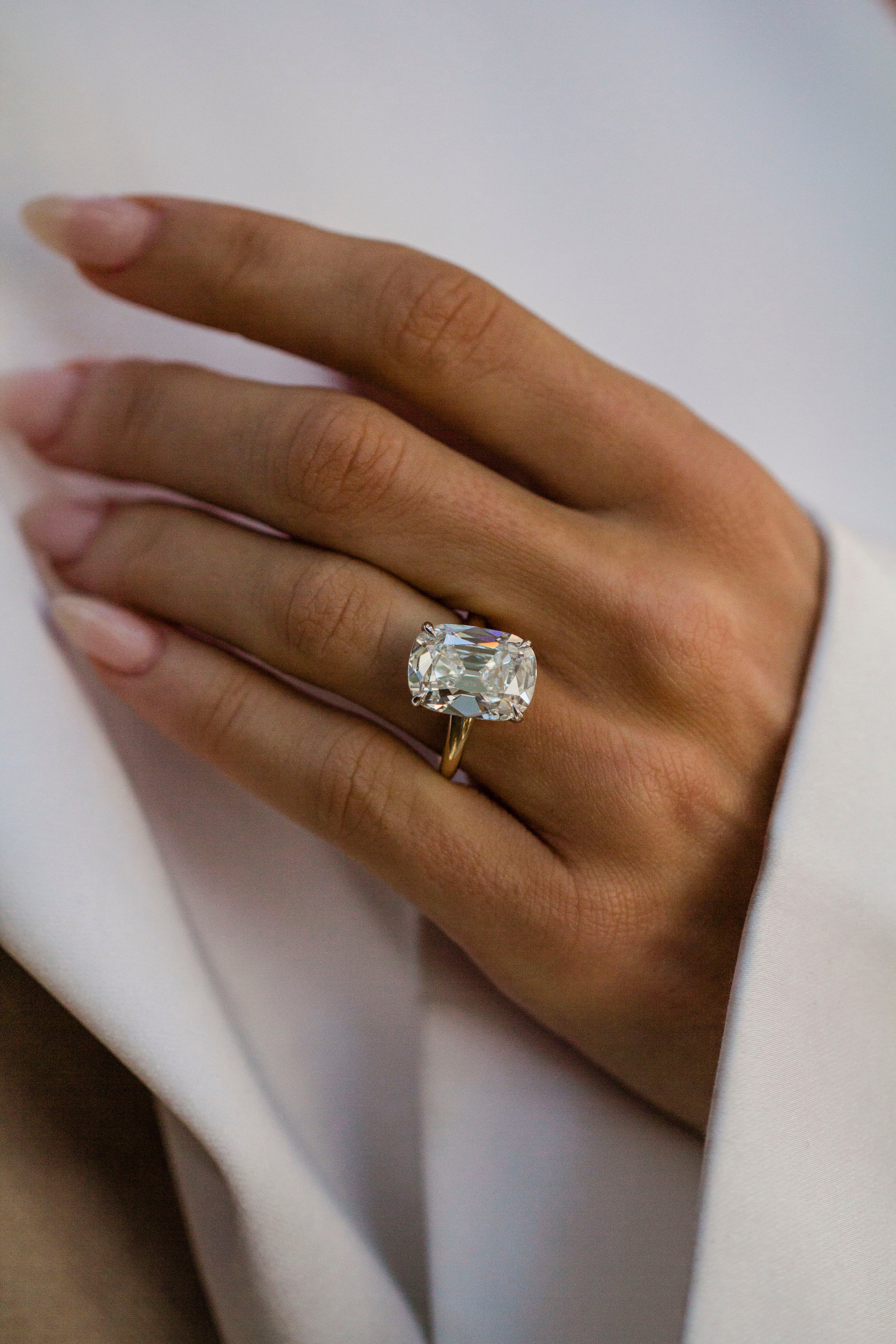 This Skinny Willa features a breathtaking 8.01 carat old mine cushion center stone with F color and VVS2 clarity. Set in a two-tone 14K yellow gold band with a 14K white gold head, the design highlights the stone’s soft, pillowed facets while keeping the look crisp and refined. The 1.5mm to 2.9mm reverse tapered solitaire band, single claw prongs, and donut upgrade create a delicate profile with a super low, durable finish. Please note that a donut sets the stone low, so a traditional wedding band will not stack perfectly flush. Want a stack that sits perfectly flush? Contact us to design a custom open band.