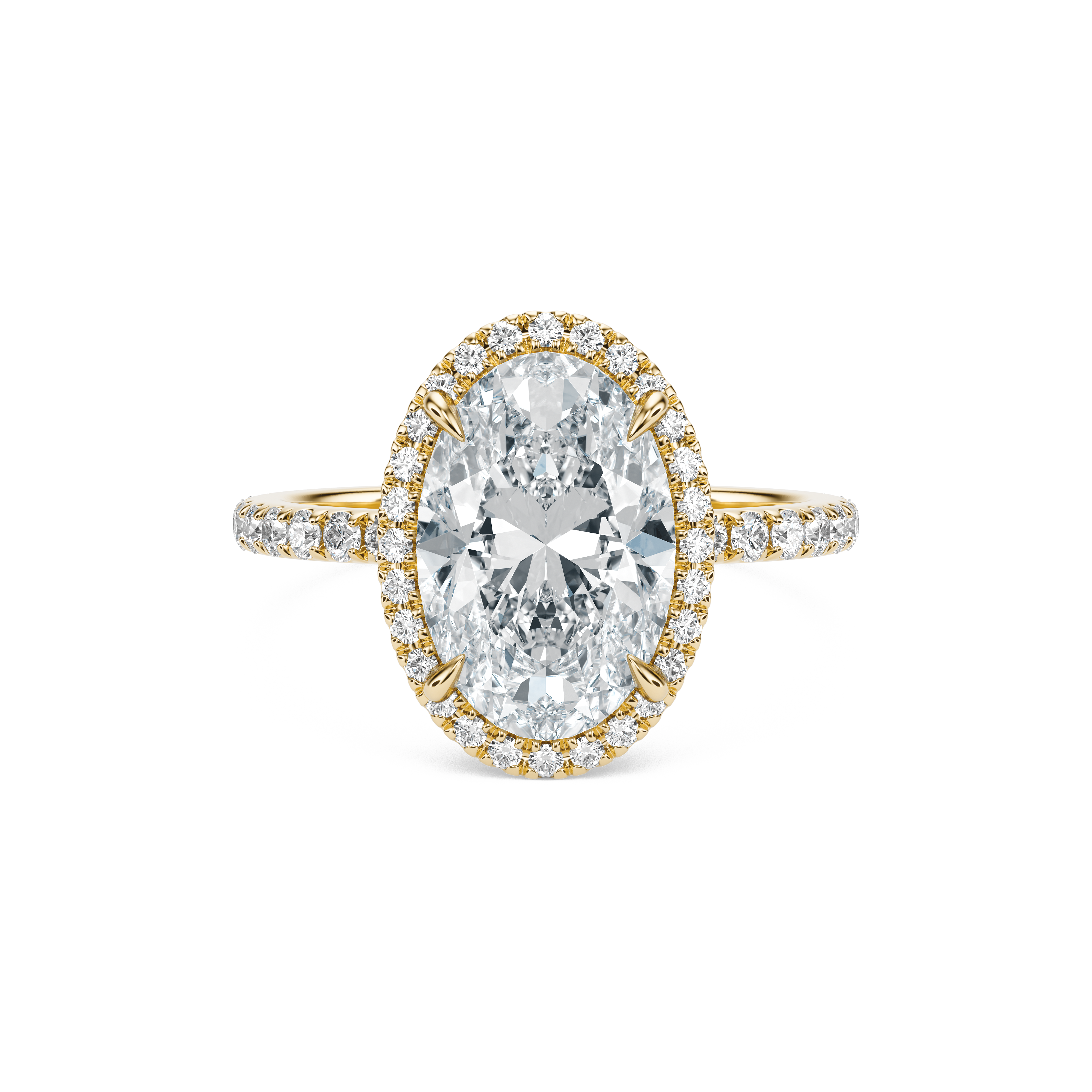 The Sophia Ring features our dantiest halo option with 1.1mm pavé surrounding your center stone of choice. It comes standard with a 1.7mm U-Prong pavé band and a donut upgrade. Our team loves seeing this style cast in one of our two tone metal option. Please note that a donut will set the stone so low that a traditional wedding band won't be able to stack perfectly flush. Want the best of both worlds with a flush stack and a donut? Contact us about our open bands for a custom fit at hello@createdrings.com.