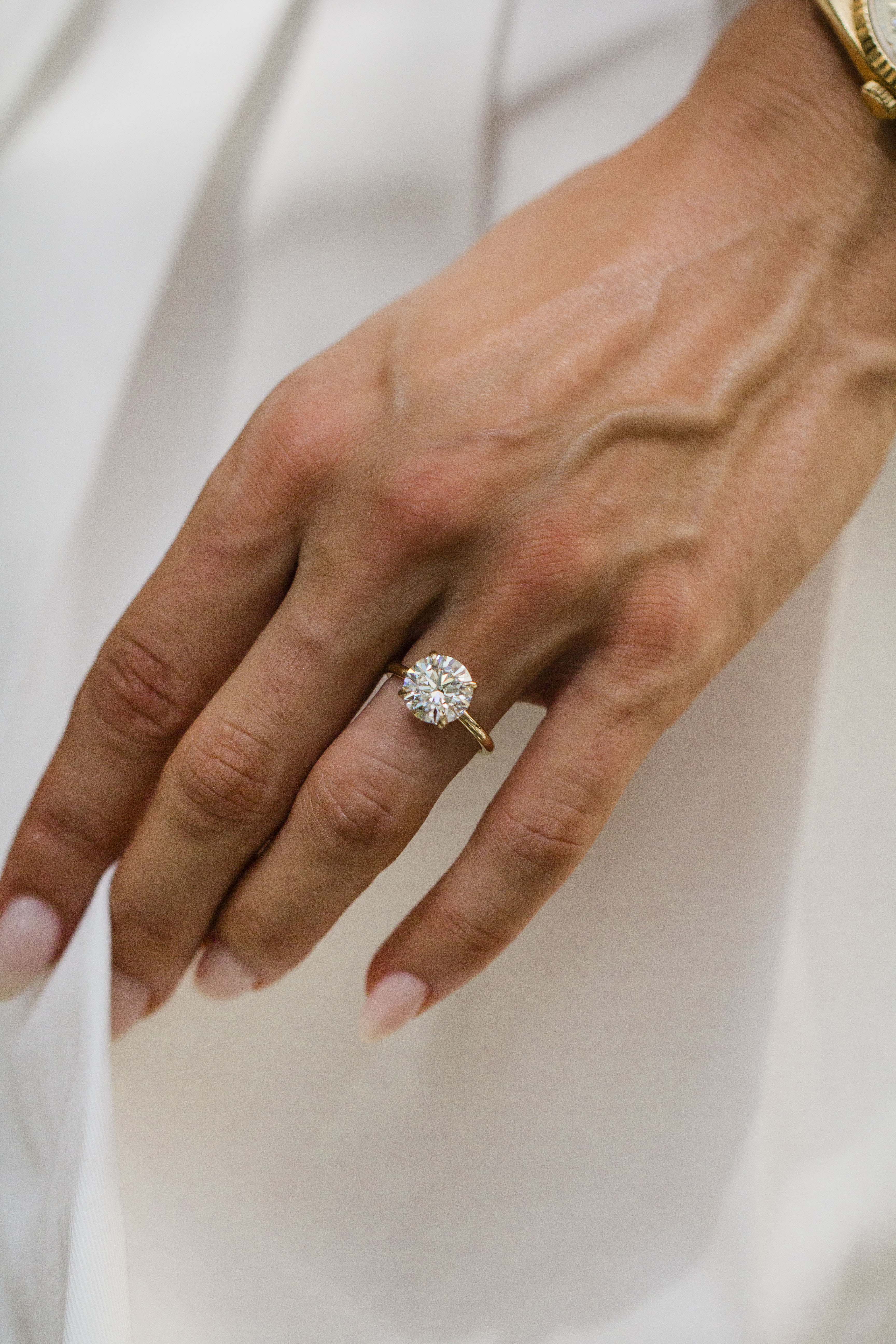 The definition of a timeless round solitaire looks something like this. This round solitaire showcases a 3.1 carat round brilliant set on our Tatum's thicker 2mm solitaire band in classic 14K yellow gold. Designed with a donut for extra support, and an invisible halo for a touch of pavé. Please note that a donut will set the stone so low that a traditional wedding band won't be able to stack perfectly flush. Want the best of both worlds with a flush stack and a donut? Contact us about our open bands for a custom fit at hello@createdrings.com.