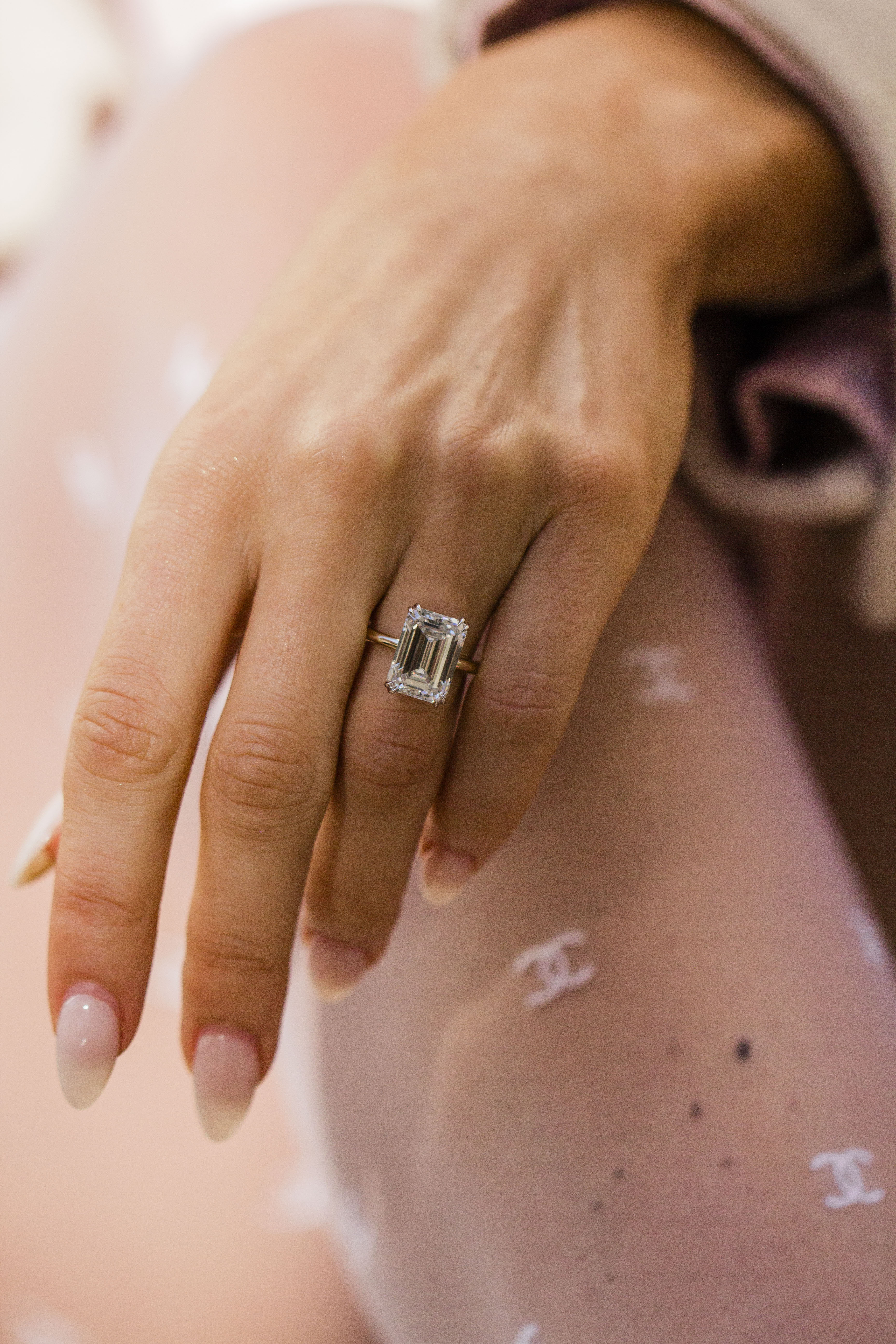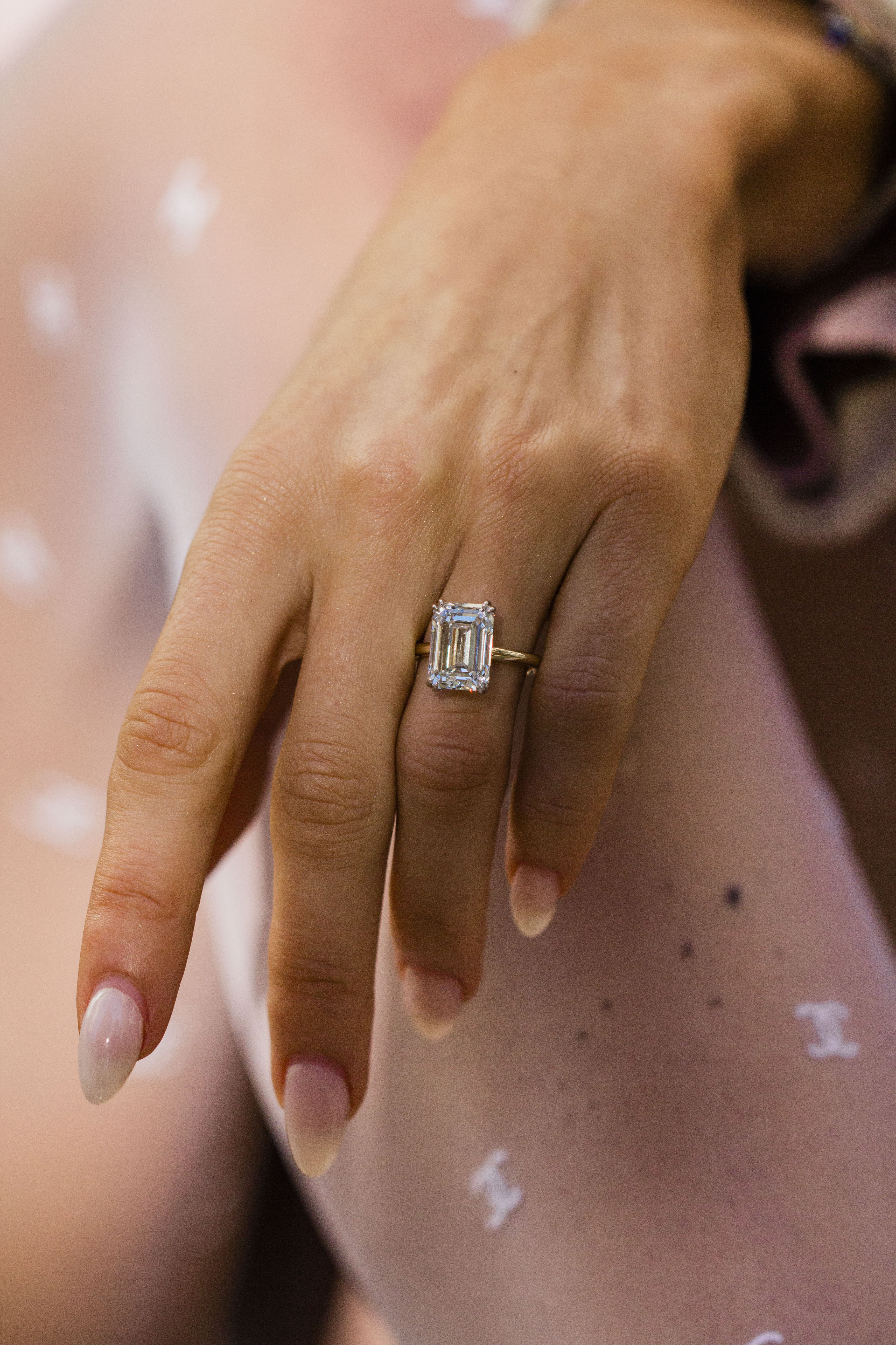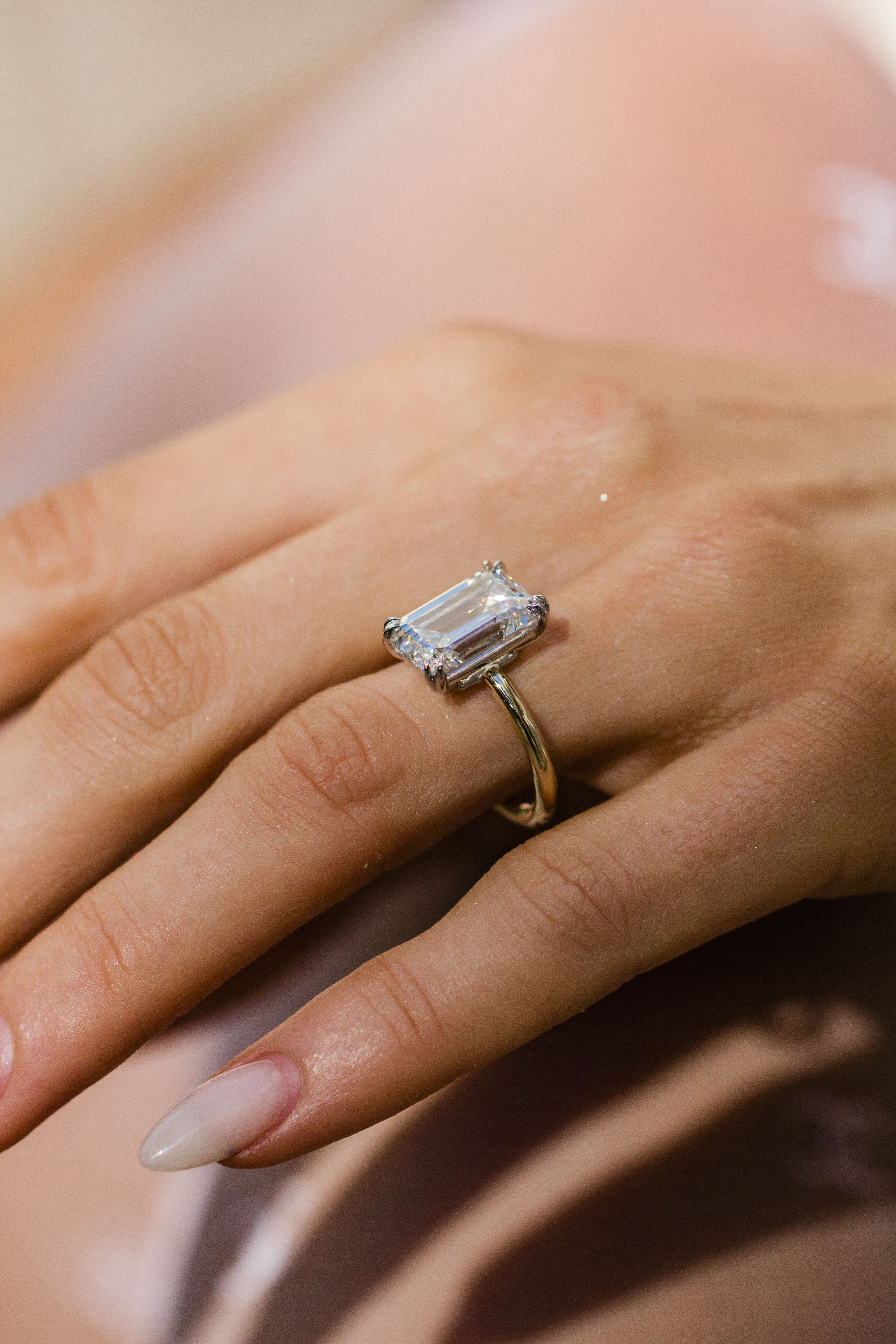 This 6.2 carat emerald-cut solitaire is set in our signature Tatum setting, designed for both presence and long-term durability. The center stone is secured with a supportive donut and paired with a clean 2mm solitaire band for added structural stability while maintaining a refined, minimal profile. Because the donut lowers the center stone on the finger, most traditional wedding bands will not sit perfectly flush. If you’d like the support of a donut with a flush stack, reach out about our custom open band options at hello@createdrings.com